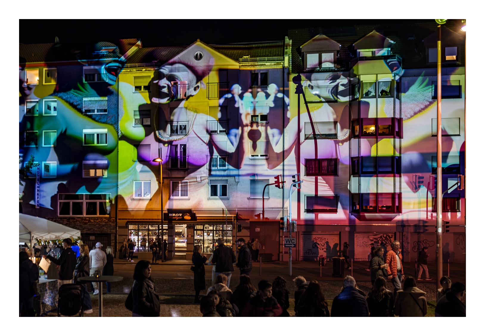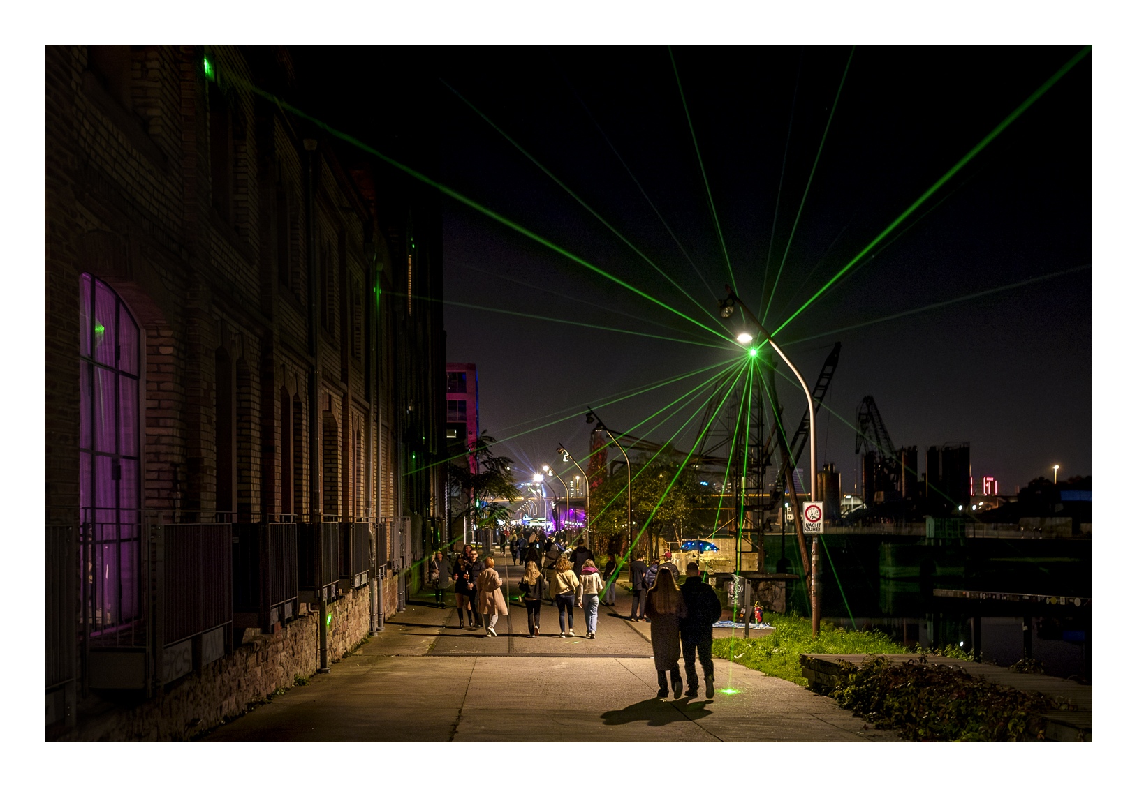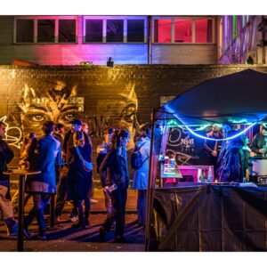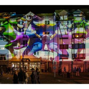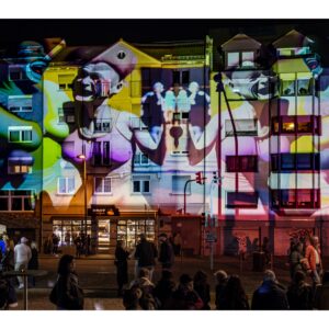 Den Begriff „Nachtwandel“ darf man ruhig wörtlich nehmen, denn es geht darum, zur nächtlichen Stunde durch die Straßen des betreffenden Stadtteils zu wandeln. Wobei „wandeln“ bei mehr als 25.000 Besuchern nicht wirklich passt. Zudem ist das Straßenquadrat zwischen Jungbusch- und Hafenstraße nicht sonderlich groß. Als wir am Samstagabend gegen 19 Uhr ankamen, war schon jede Mange Betrieb. Entlang der Straßen wurden Speisen und Getränke für jeden Geschmack angeboten, darunter viel Exotisches. In den Innenhöfen spielten Live-Bands oder DJs legten auf. Es gab auch kleine Kunstausstellungen und sehenswerte Licht-Installationen. Nicht zu vergessen die Kneipen – davon gibt es hier wirklich jede Menge und jede erdenkliche Art. Die Stimmung war wirklich gut und wir konnten die ungewöhnliche Atmosphäre genießen. Zwei Stunden später wurde es dann aber richtig voll und laut. Die Höfe und Kneipen waren vollgestopft und es wurde uns allmählich zu viel. Wahrscheinlich sind wir dafür dann doch schon etwas zu alt ;-). So gegen 22 Uhr haben wir uns dann auf den Rückweg gemacht und den Abend im heimischen Wohnzimmer ausklingen lassen.