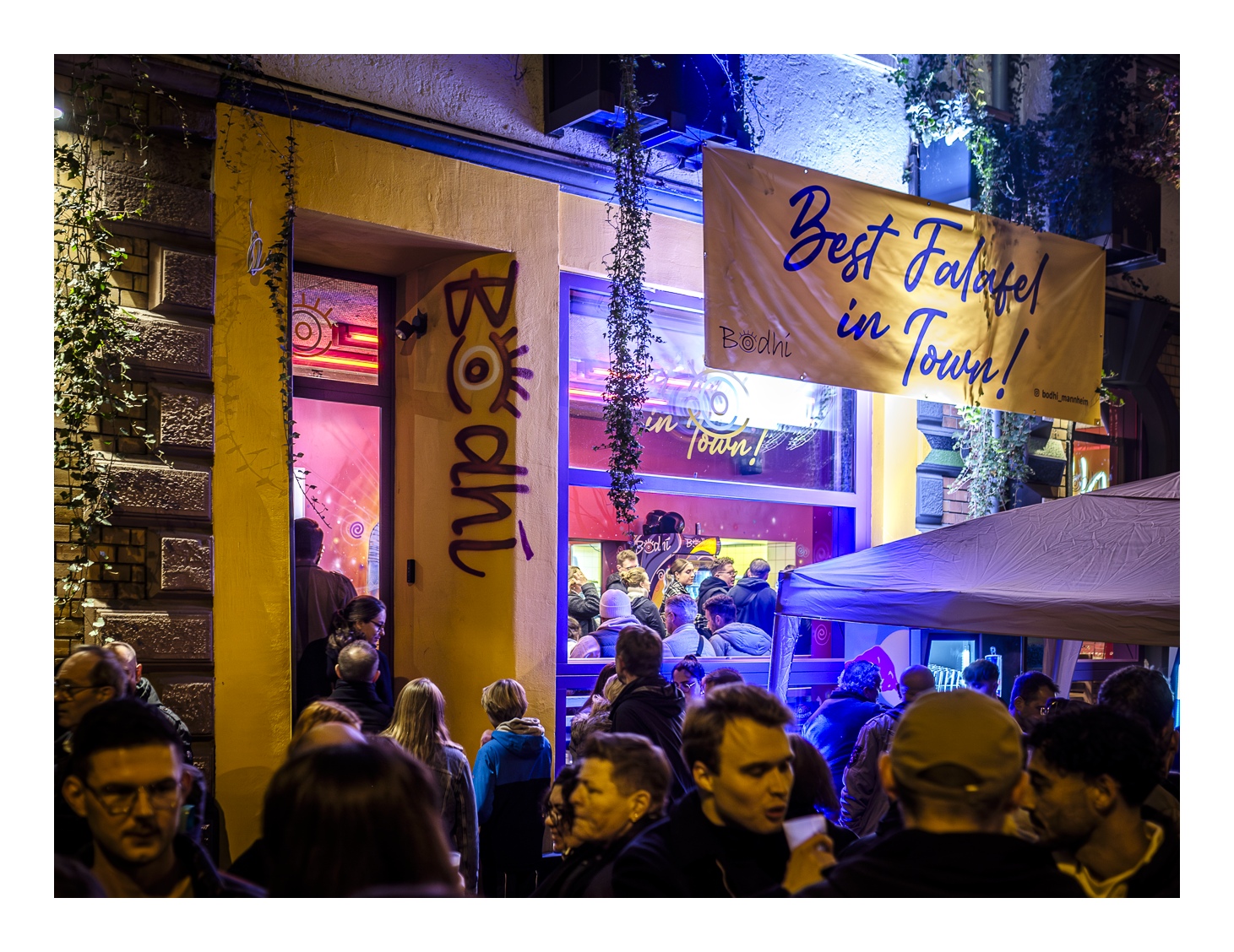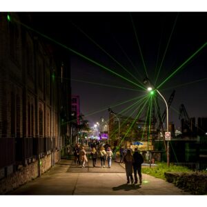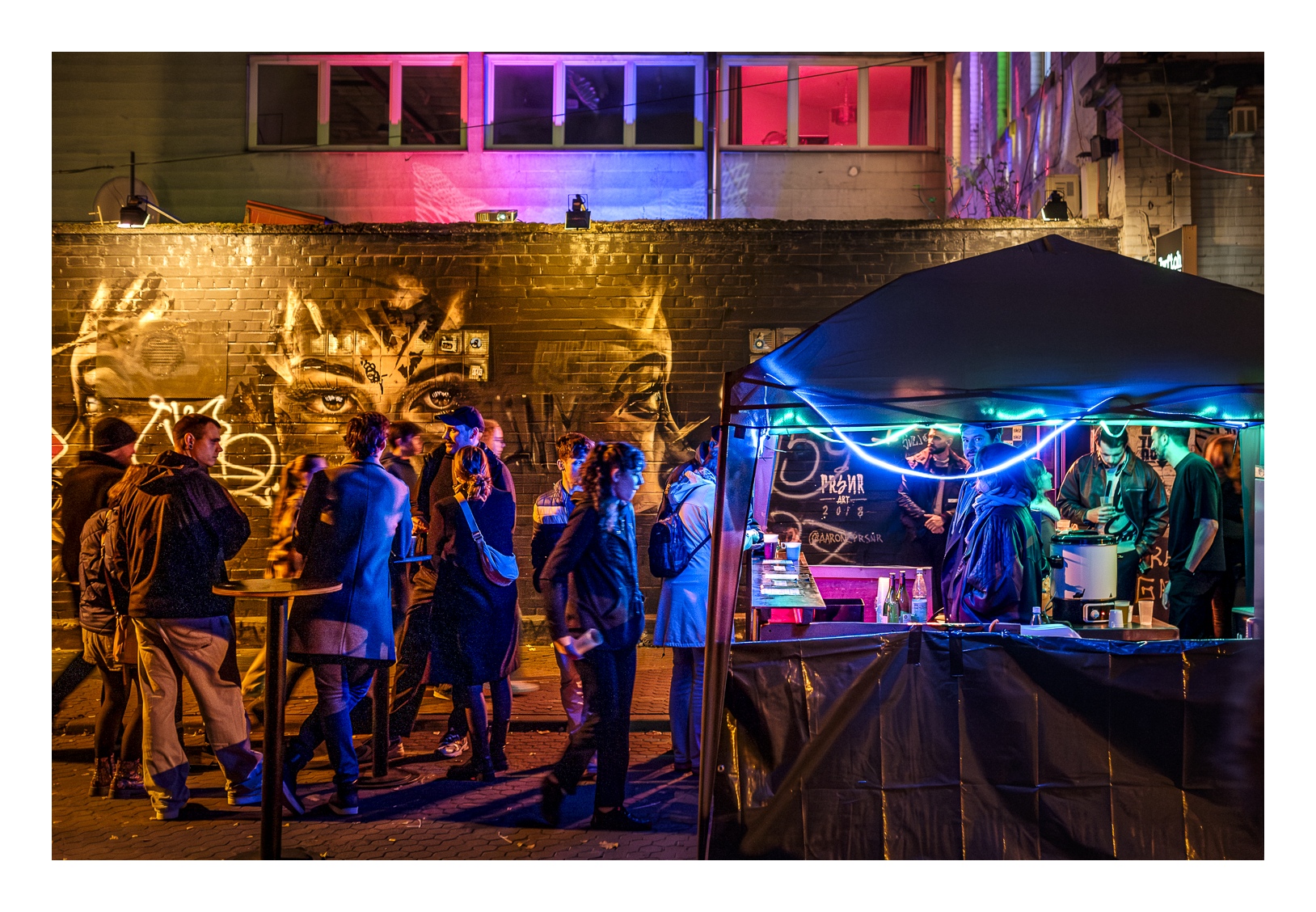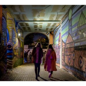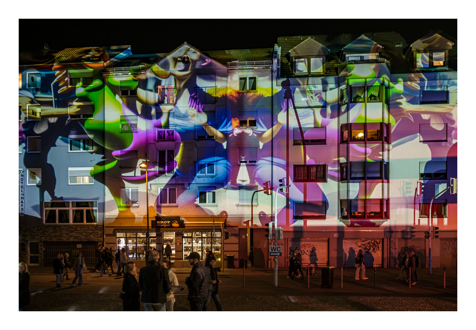 Den Begriff „Nachtwandel“ darf man ruhig wörtlich nehmen, denn es geht darum, zur nächtlichen Stunde durch die Straßen des betreffenden Stadtteils zu wandeln. Wobei „wandeln“ bei mehr als 25.000 Besuchern nicht wirklich passt. Zudem ist das Straßenquadrat zwischen Jungbusch- und Hafenstraße nicht sonderlich groß. Als wir am Samstagabend gegen 19 Uhr ankamen, war schon jede Mange Betrieb. Entlang der Straßen wurden Speisen und Getränke für jeden Geschmack angeboten, darunter viel Exotisches. In den Innenhöfen spielten Live-Bands oder DJs legten auf. Es gab auch kleine Kunstausstellungen und sehenswerte Licht-Installationen. Nicht zu vergessen die Kneipen – davon gibt es hier wirklich jede Menge und jede erdenkliche Art. Die Stimmung war wirklich gut und wir konnten die ungewöhnliche Atmosphäre genießen. Zwei Stunden später wurde es dann aber richtig voll und laut. Die Höfe und Kneipen waren vollgestopft und es wurde uns allmählich zu viel. Wahrscheinlich sind wir dafür dann doch schon etwas zu alt ;-). So gegen 22 Uhr haben wir uns dann auf den Rückweg gemacht und den Abend im heimischen Wohnzimmer ausklingen lassen.