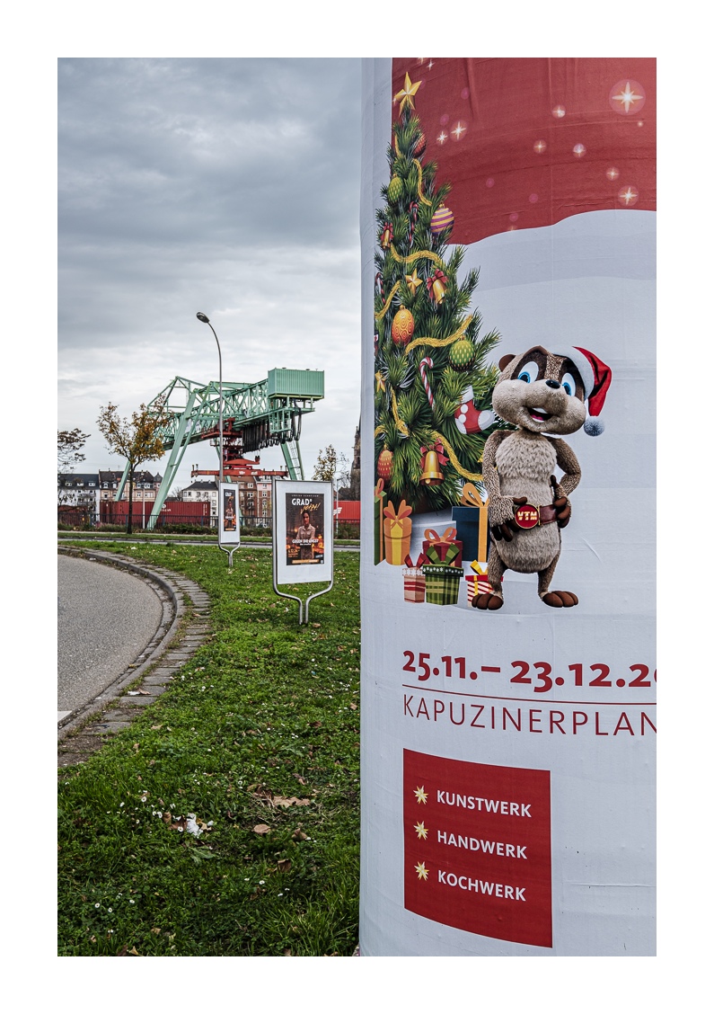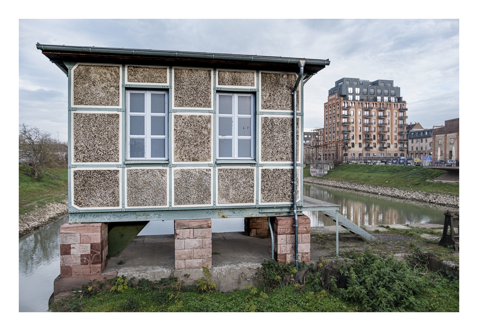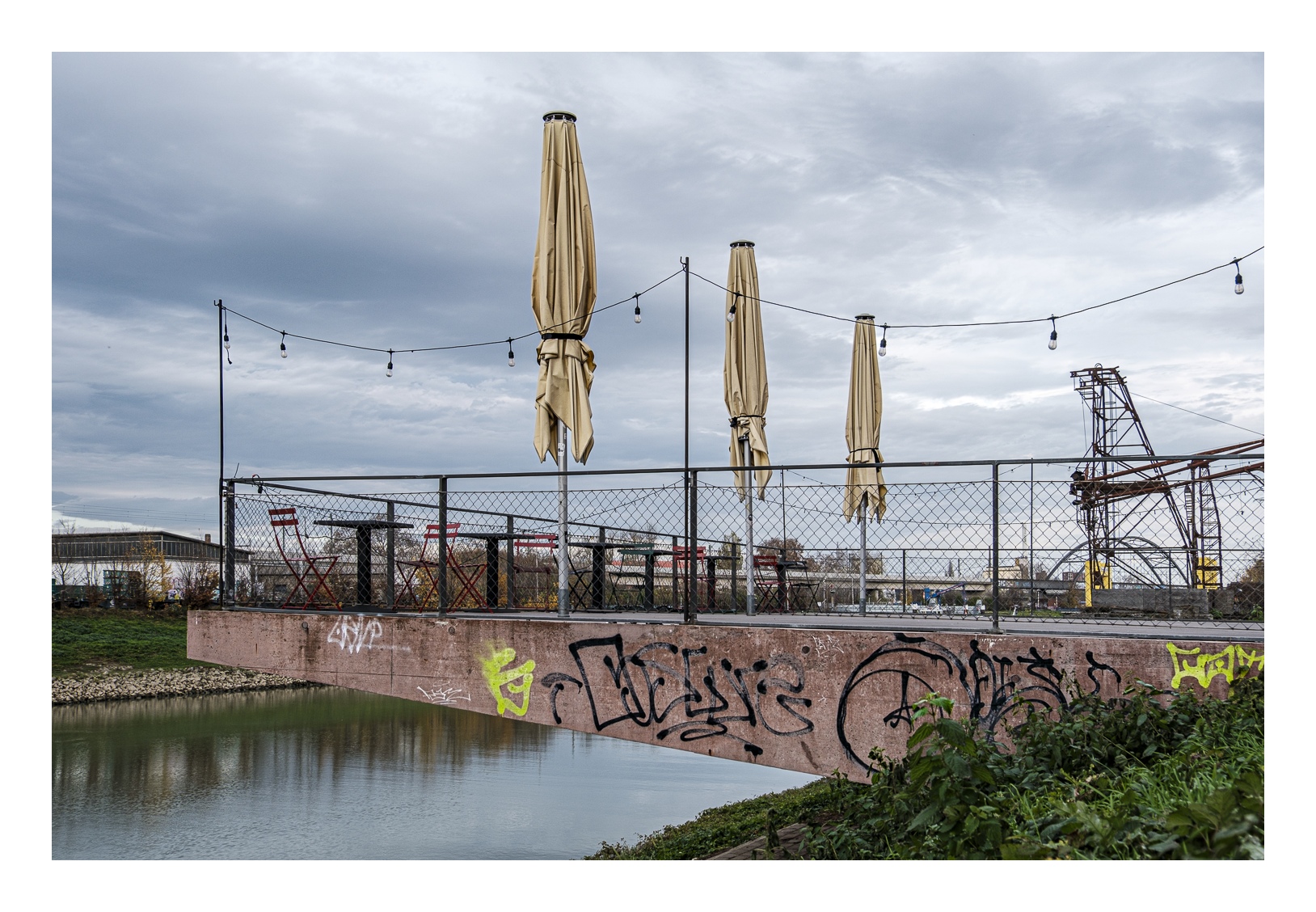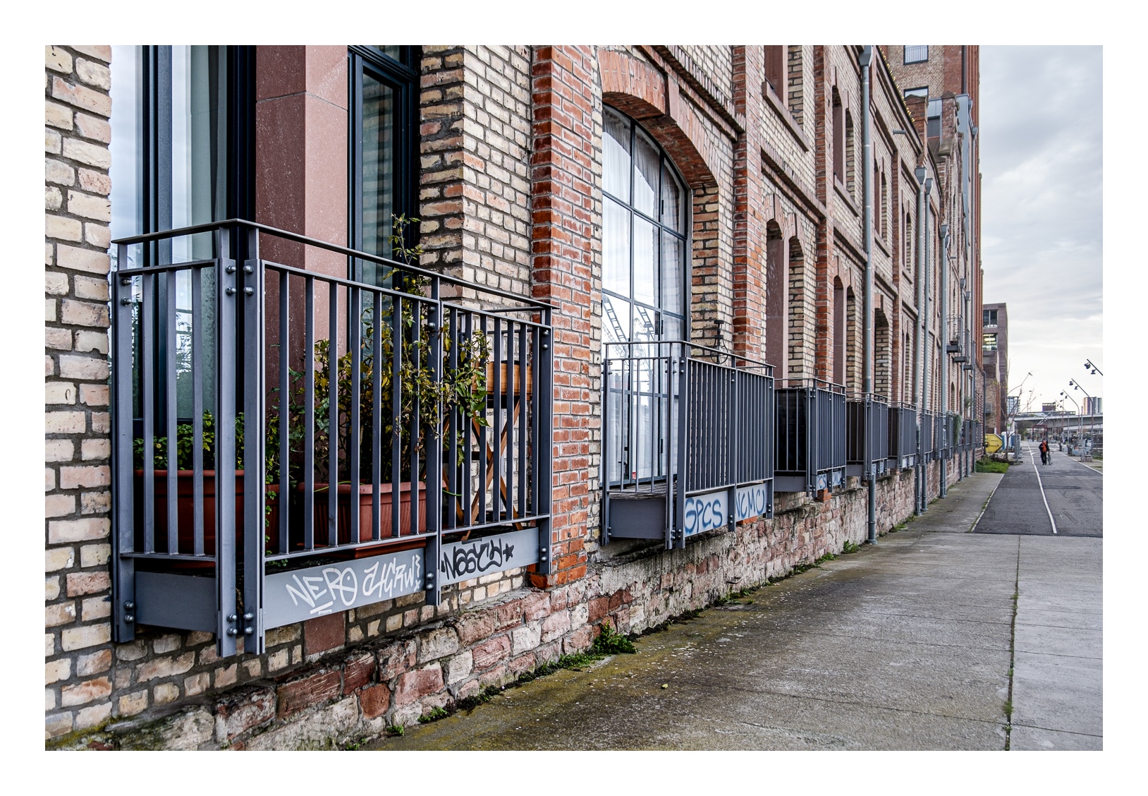 Ich hatte den Mannheimer Stadtteil Jungbusch vorgeschlagen, wo ich vor vor ein paar Wochen abends beim „Nachtwandel“ unterwegs war (-> hier klicken!). In diesem ehemaligen Hafenviertel findet man eigentlich immer interessante Motive und auch diesmal konnte ich mich nicht beschweren. Jedenfalls habe ich ziemlich viel geknipst. Es hat für meinen Geschmack zwar etwas an Licht gefehlt, dafür war der Himmel aber wenigstens einigermaßen strukturiert. Meine Bilder habe ich mit der Fuji-Filmsimulation „Classic Chrome“ entwickelt, die durch ihren Cyan-Ton und die starken Kontraste recht gut zu der eher düsteren Lichtstimmung passt.