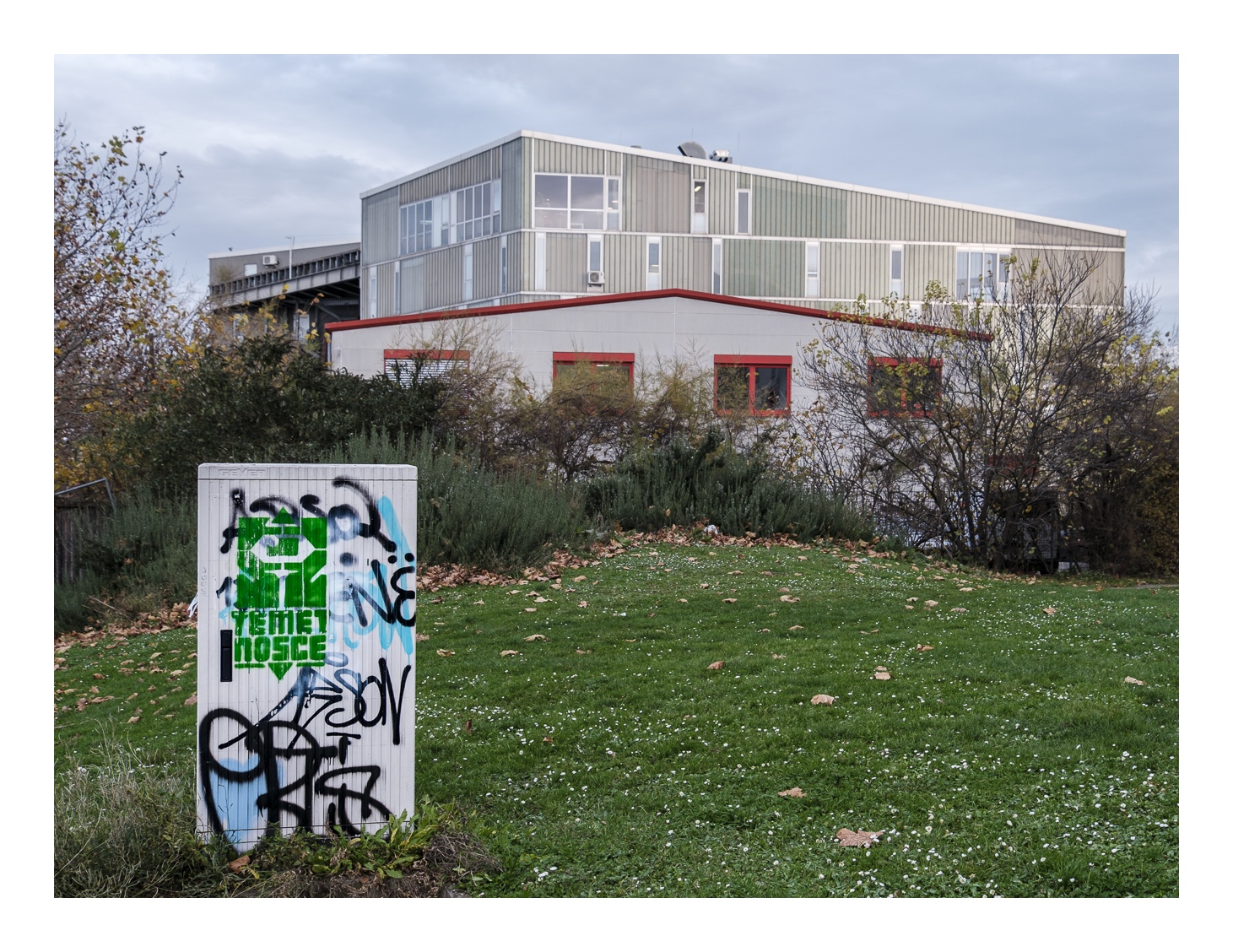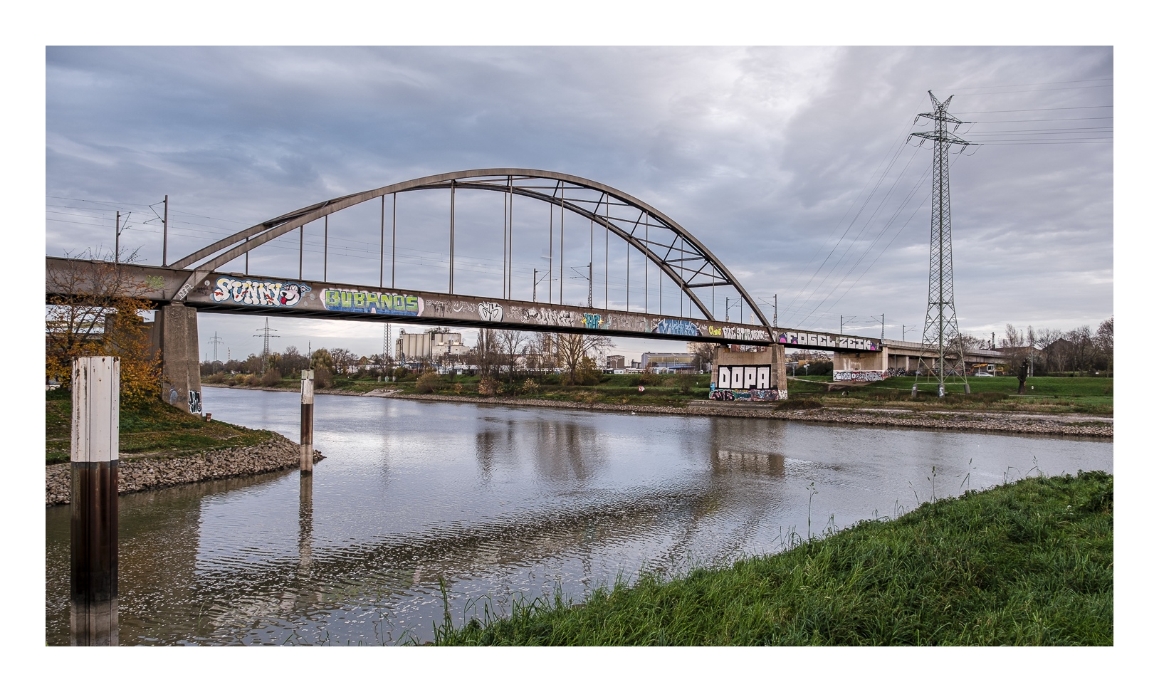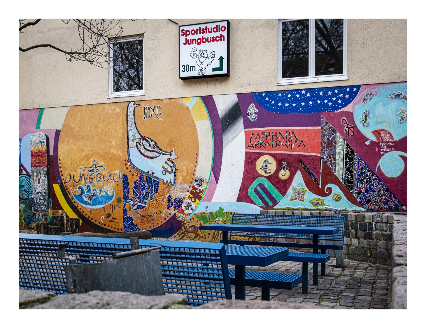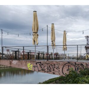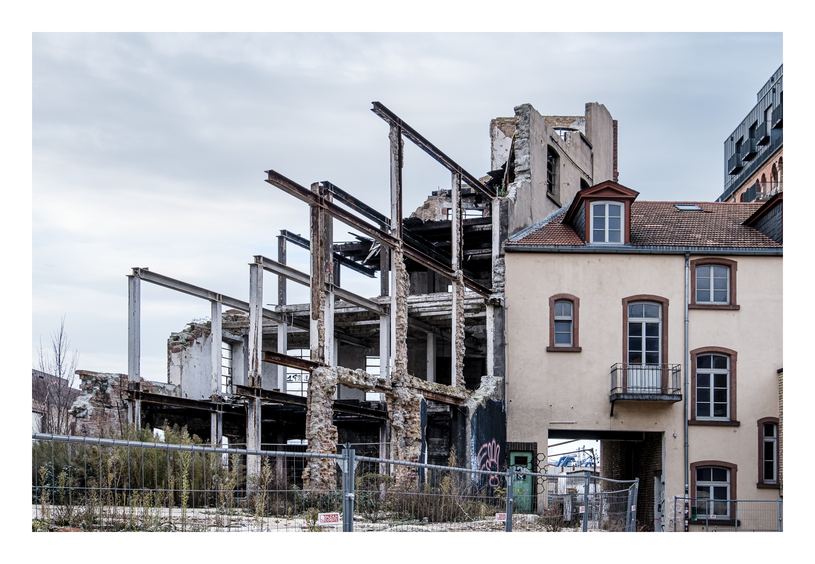 Ich hatte den Mannheimer Stadtteil Jungbusch vorgeschlagen, wo ich vor vor ein paar Wochen abends beim „Nachtwandel“ unterwegs war (-> hier klicken!). In diesem ehemaligen Hafenviertel findet man eigentlich immer interessante Motive und auch diesmal konnte ich mich nicht beschweren. Jedenfalls habe ich ziemlich viel geknipst. Es hat für meinen Geschmack zwar etwas an Licht gefehlt, dafür war der Himmel aber wenigstens einigermaßen strukturiert. Meine Bilder habe ich mit der Fuji-Filmsimulation „Classic Chrome“ entwickelt, die durch ihren Cyan-Ton und die starken Kontraste recht gut zu der eher düsteren Lichtstimmung passt.