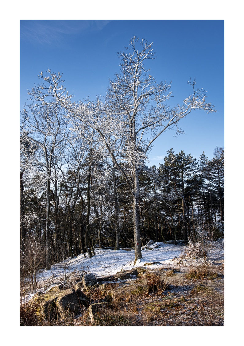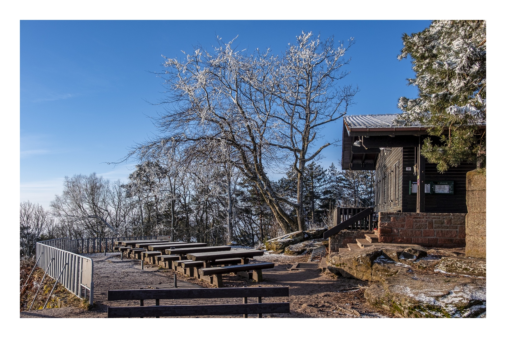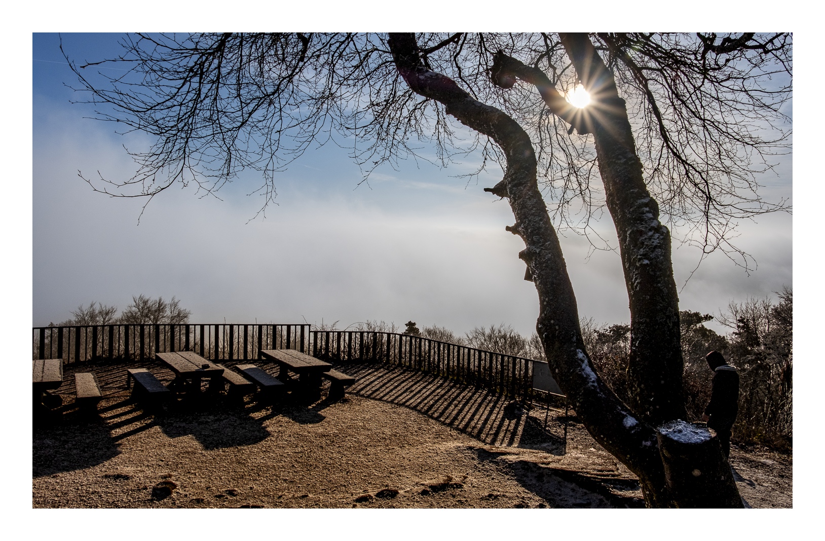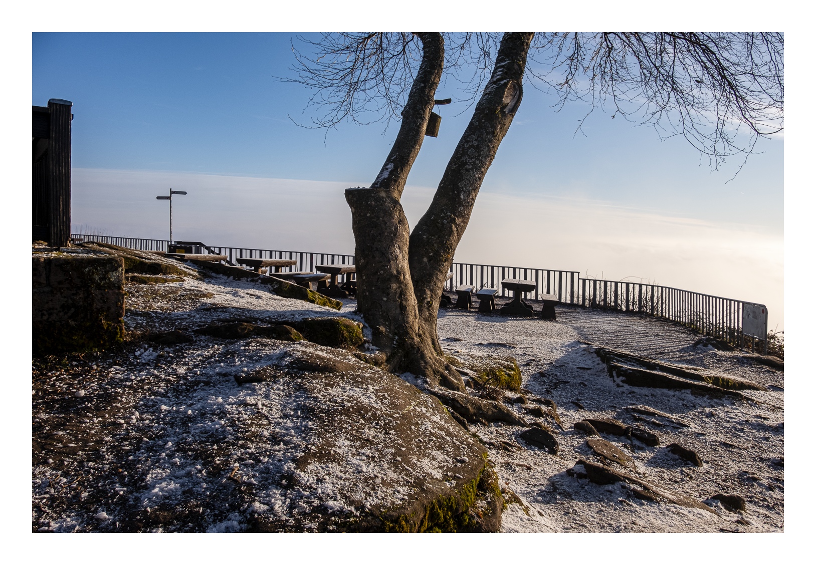 In den Wetterbildern des SWR vom Wochenende waren schöne Aufnahmen des vereisten Kalmit-Gipfels zu sehen. Das wollten wir uns nicht entgehen lassen. Gerd (www.gerd-stauder.de) und ich sind daher gleich am Montagmorgen gestartet, um dieses Naturschauspiel fotografisch einzufangen. Leider zu spät! Außer ein paar Schneeresten und wenigen Eiskristallen auf den Blättern war von der winterlichen Pracht nichts mehr zu sehen. Interessant war aber die Anfahrt. Auf dem Weg nach oben fuhren wir durch eine Schicht dichten Nebels und kamen dann unmittelbar unter dem Gipfel in wunderbaren Sonnenschein, allerdings bei frostigen -3 Grad. Ich fand diese Winterlandschaft auch ohne viel Schnee wunderschön und habe versucht, die Stimmung im Bild festzuhalten. Ganz schön schwierig, denn die Kamera hat einen wesentlich neutraleren Blick als das Auge.