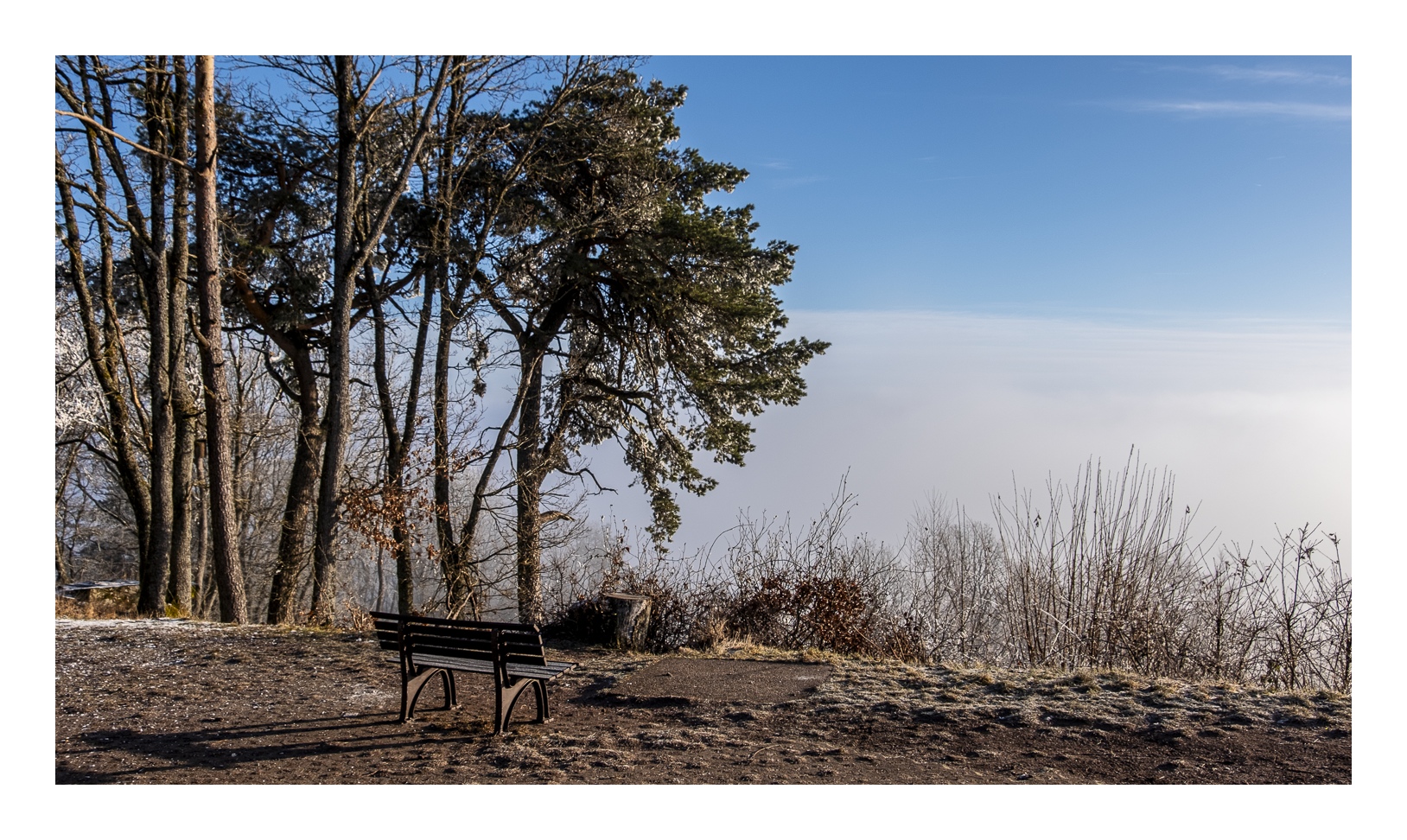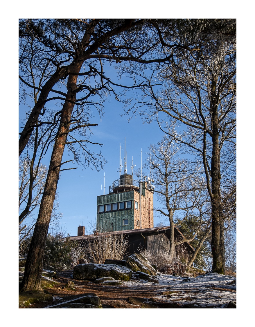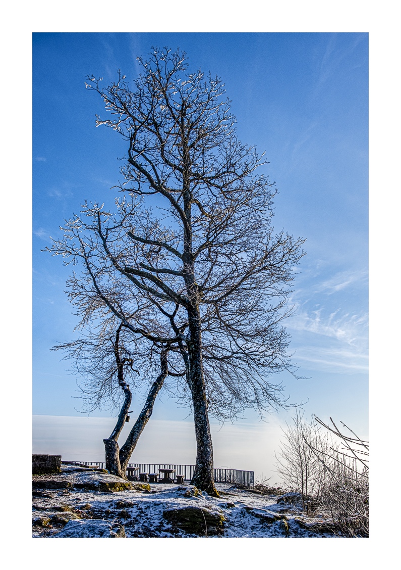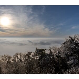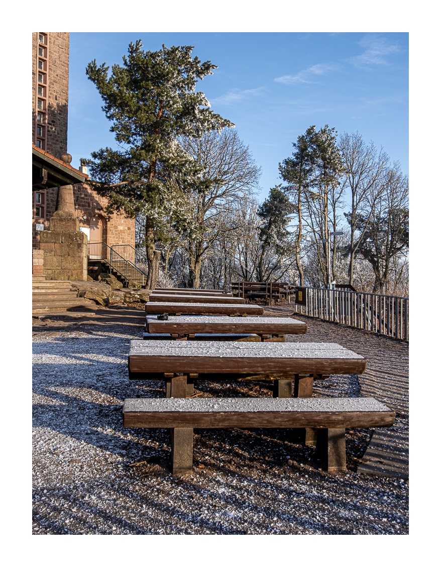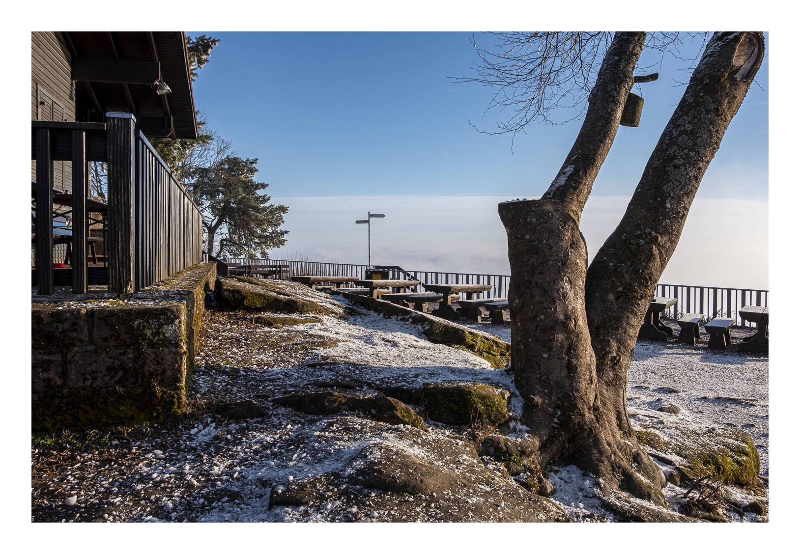 In den Wetterbildern des SWR vom Wochenende waren schöne Aufnahmen des vereisten Kalmit-Gipfels zu sehen. Das wollten wir uns nicht entgehen lassen. Gerd (www.gerd-stauder.de) und ich sind daher gleich am Montagmorgen gestartet, um dieses Naturschauspiel fotografisch einzufangen. Leider zu spät! Außer ein paar Schneeresten und wenigen Eiskristallen auf den Blättern war von der winterlichen Pracht nichts mehr zu sehen. Interessant war aber die Anfahrt. Auf dem Weg nach oben fuhren wir durch eine Schicht dichten Nebels und kamen dann unmittelbar unter dem Gipfel in wunderbaren Sonnenschein, allerdings bei frostigen -3 Grad. Ich fand diese Winterlandschaft auch ohne viel Schnee wunderschön und habe versucht, die Stimmung im Bild festzuhalten. Ganz schön schwierig, denn die Kamera hat einen wesentlich neutraleren Blick als das Auge.