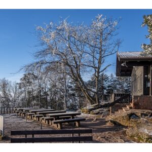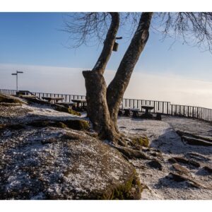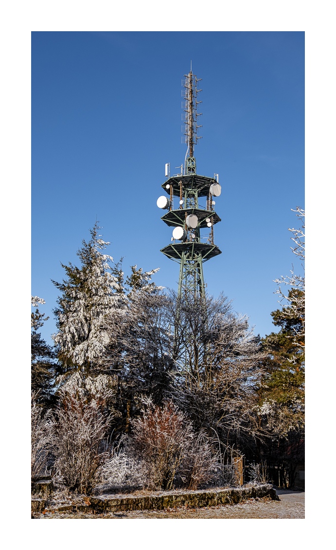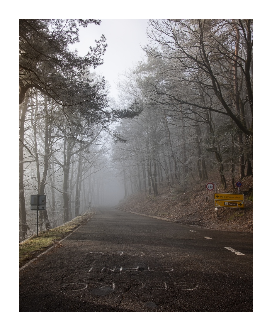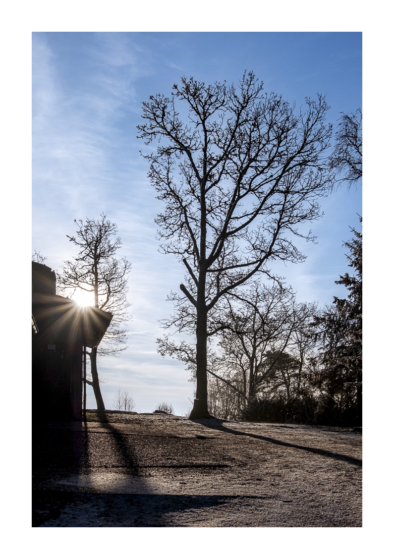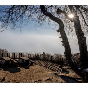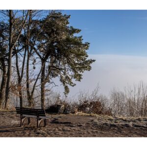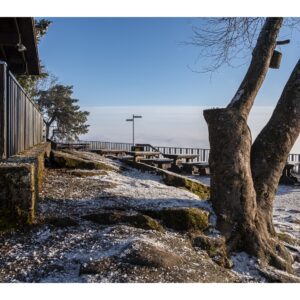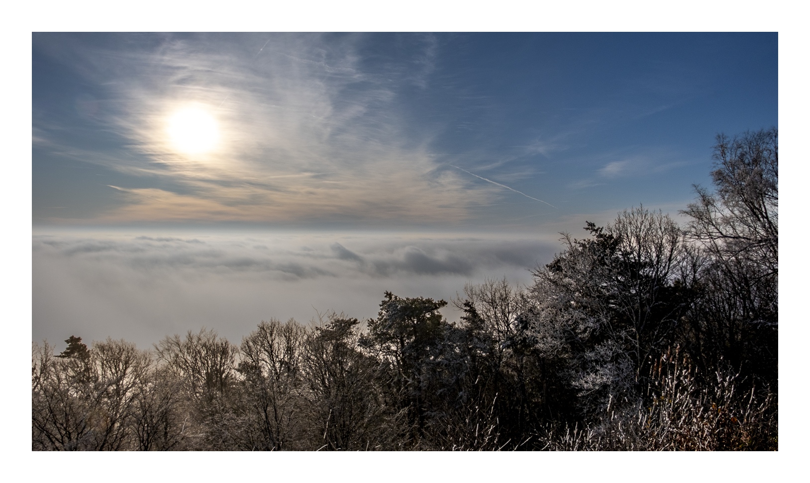 In den Wetterbildern des SWR vom Wochenende waren schöne Aufnahmen des vereisten Kalmit-Gipfels zu sehen. Das wollten wir uns nicht entgehen lassen. Gerd (www.gerd-stauder.de) und ich sind daher gleich am Montagmorgen gestartet, um dieses Naturschauspiel fotografisch einzufangen. Leider zu spät! Außer ein paar Schneeresten und wenigen Eiskristallen auf den Blättern war von der winterlichen Pracht nichts mehr zu sehen. Interessant war aber die Anfahrt. Auf dem Weg nach oben fuhren wir durch eine Schicht dichten Nebels und kamen dann unmittelbar unter dem Gipfel in wunderbaren Sonnenschein, allerdings bei frostigen -3 Grad. Ich fand diese Winterlandschaft auch ohne viel Schnee wunderschön und habe versucht, die Stimmung im Bild festzuhalten. Ganz schön schwierig, denn die Kamera hat einen wesentlich neutraleren Blick als das Auge.