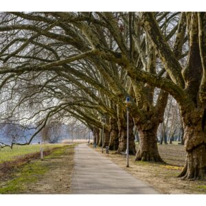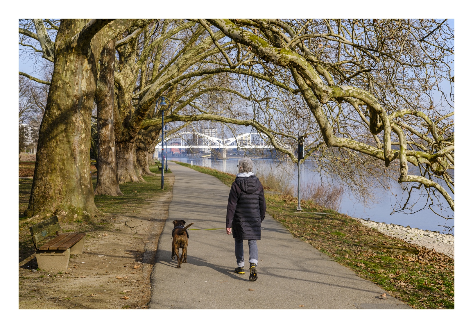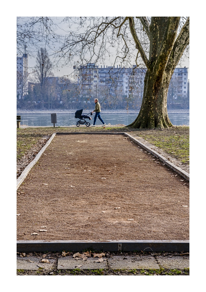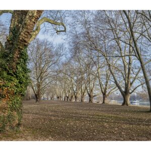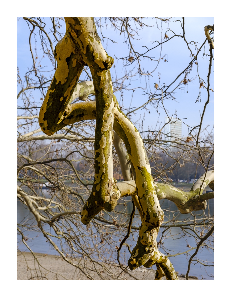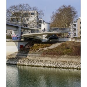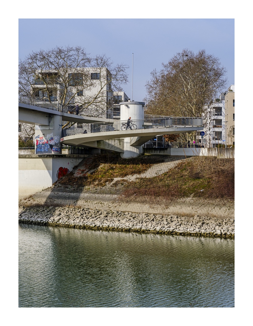 Der nördliche Teil dieser lang gestreckten Insel zwischen dem Luitpoldhafen und dem Rhein hat einen ganz anderen Charakter als der südliche, den wir vor 14 Tagen besucht hatten. Er wird dominiert von einer Platanen-Allee mit wirklich beeindruckenden alten Bäumen. Ganz am nördlichen Ende der Insel steht die „Schneckenudelbrick“, eine ca. 60 Meter lange Fußgängerbrücke über das Hafenbecken mit ihren typischen, spiralförmigen Aufgängen.