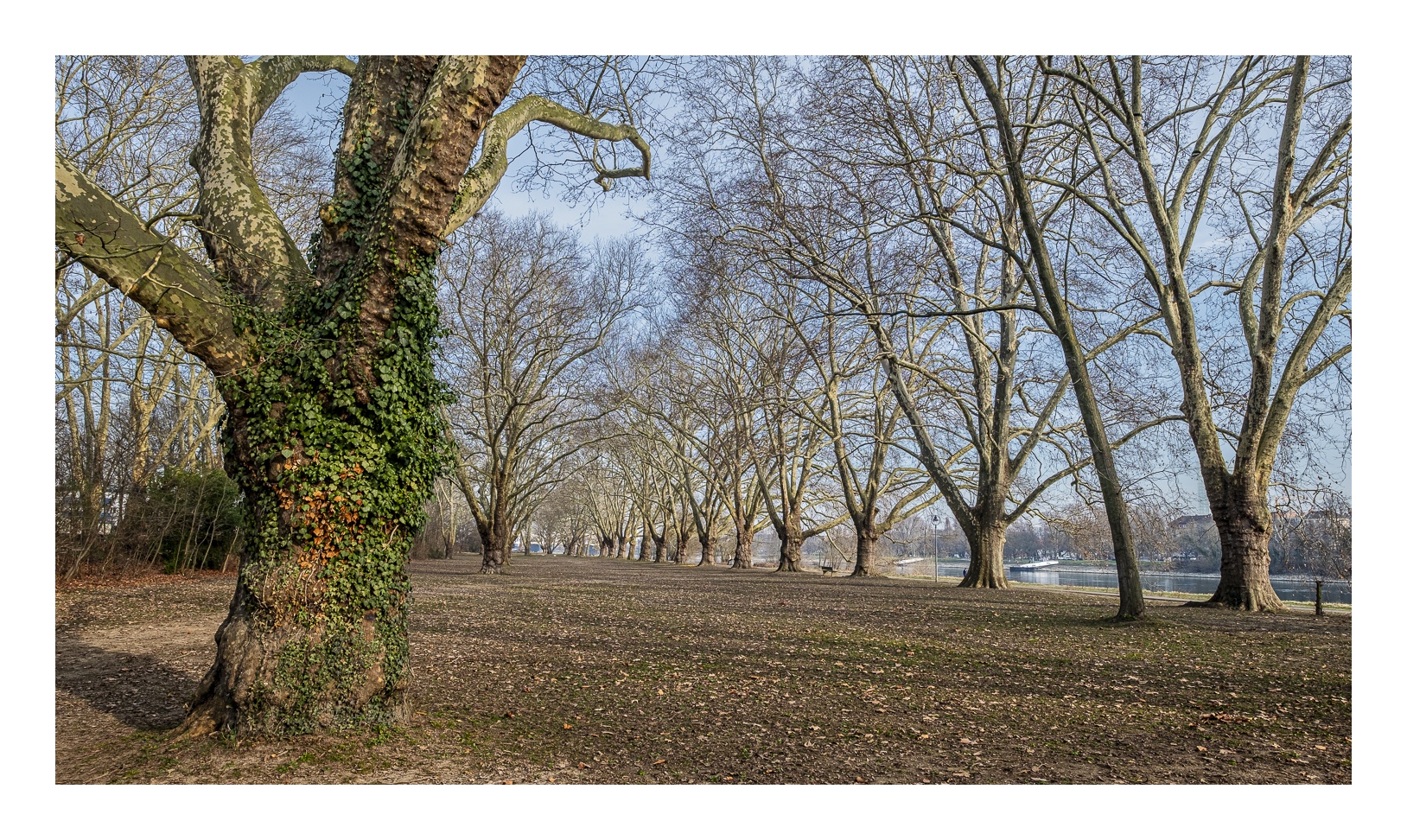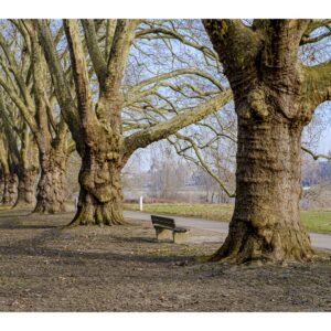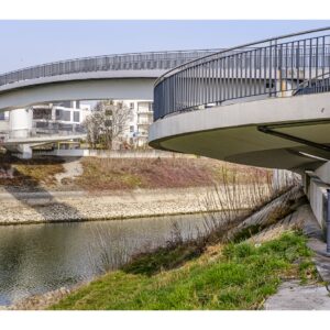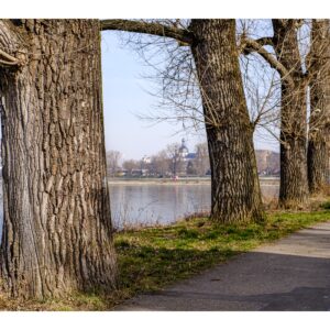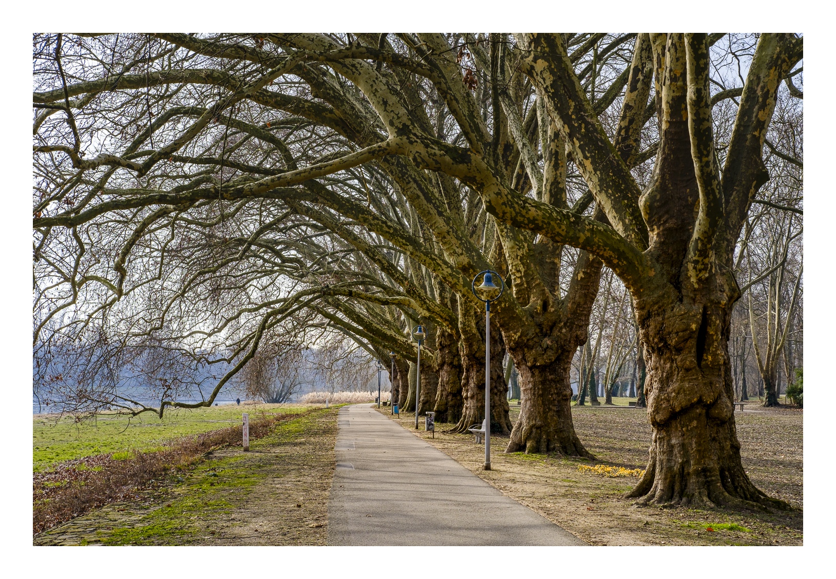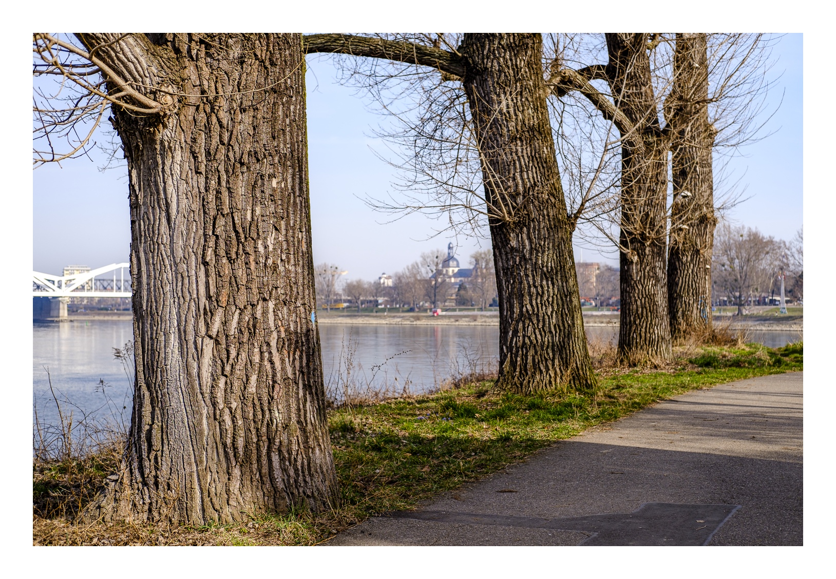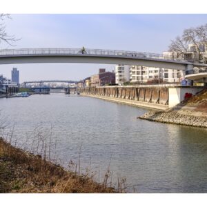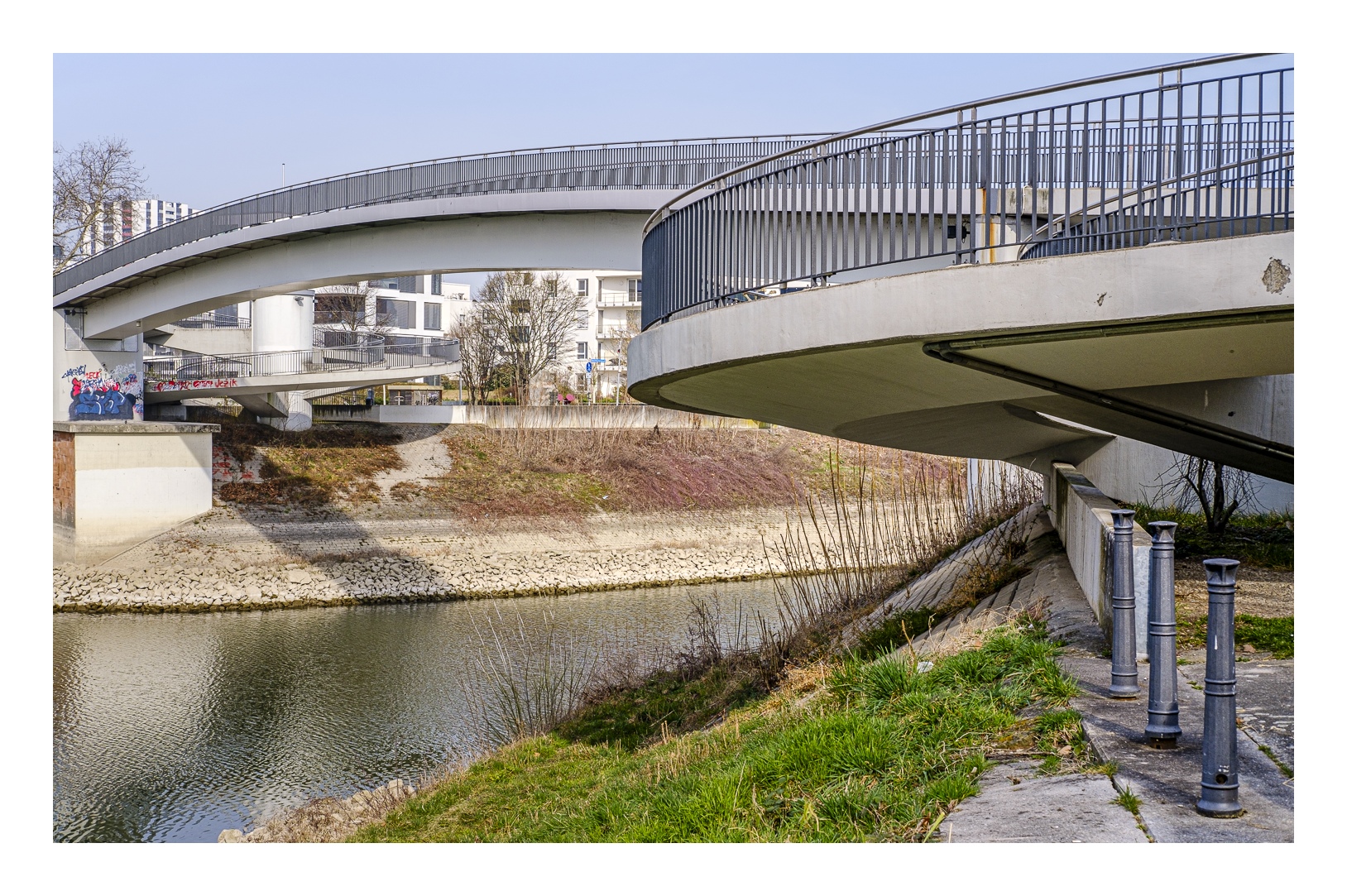 Der nördliche Teil dieser lang gestreckten Insel zwischen dem Luitpoldhafen und dem Rhein hat einen ganz anderen Charakter als der südliche, den wir vor 14 Tagen besucht hatten. Er wird dominiert von einer Platanen-Allee mit wirklich beeindruckenden alten Bäumen. Ganz am nördlichen Ende der Insel steht die „Schneckenudelbrick“, eine ca. 60 Meter lange Fußgängerbrücke über das Hafenbecken mit ihren typischen, spiralförmigen Aufgängen.