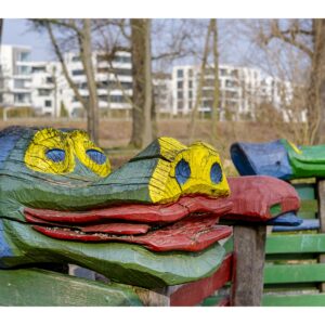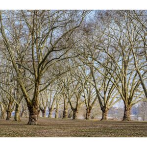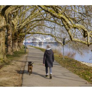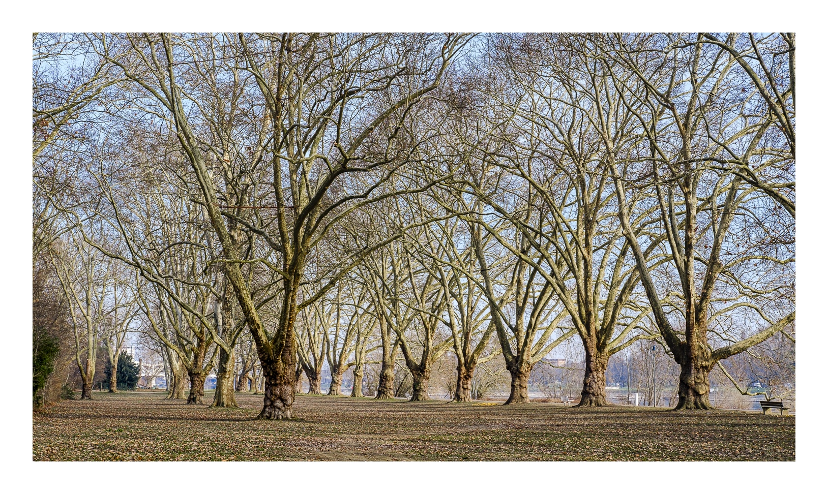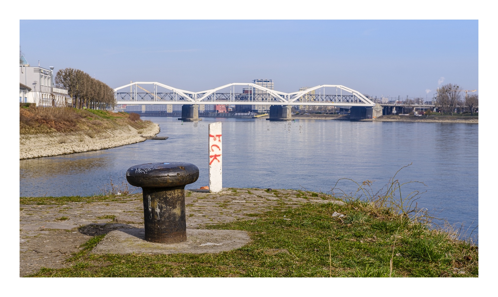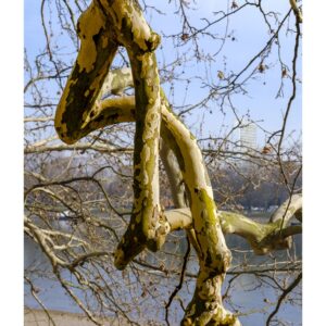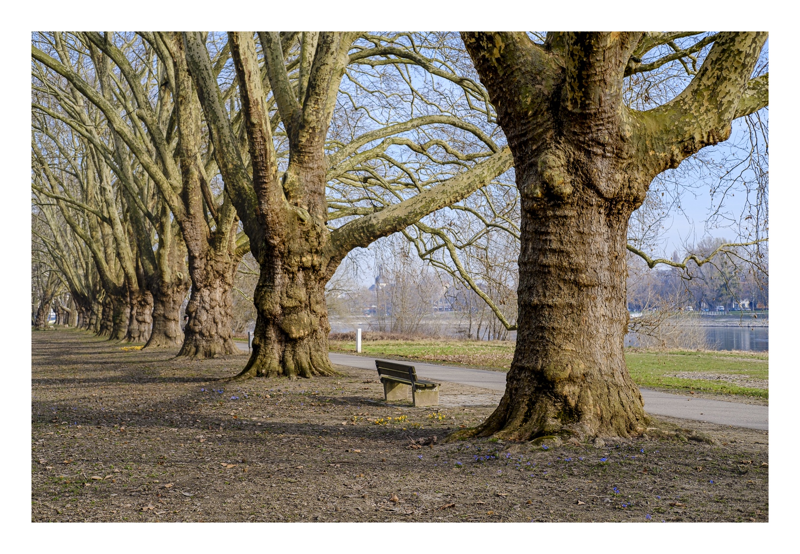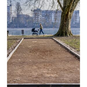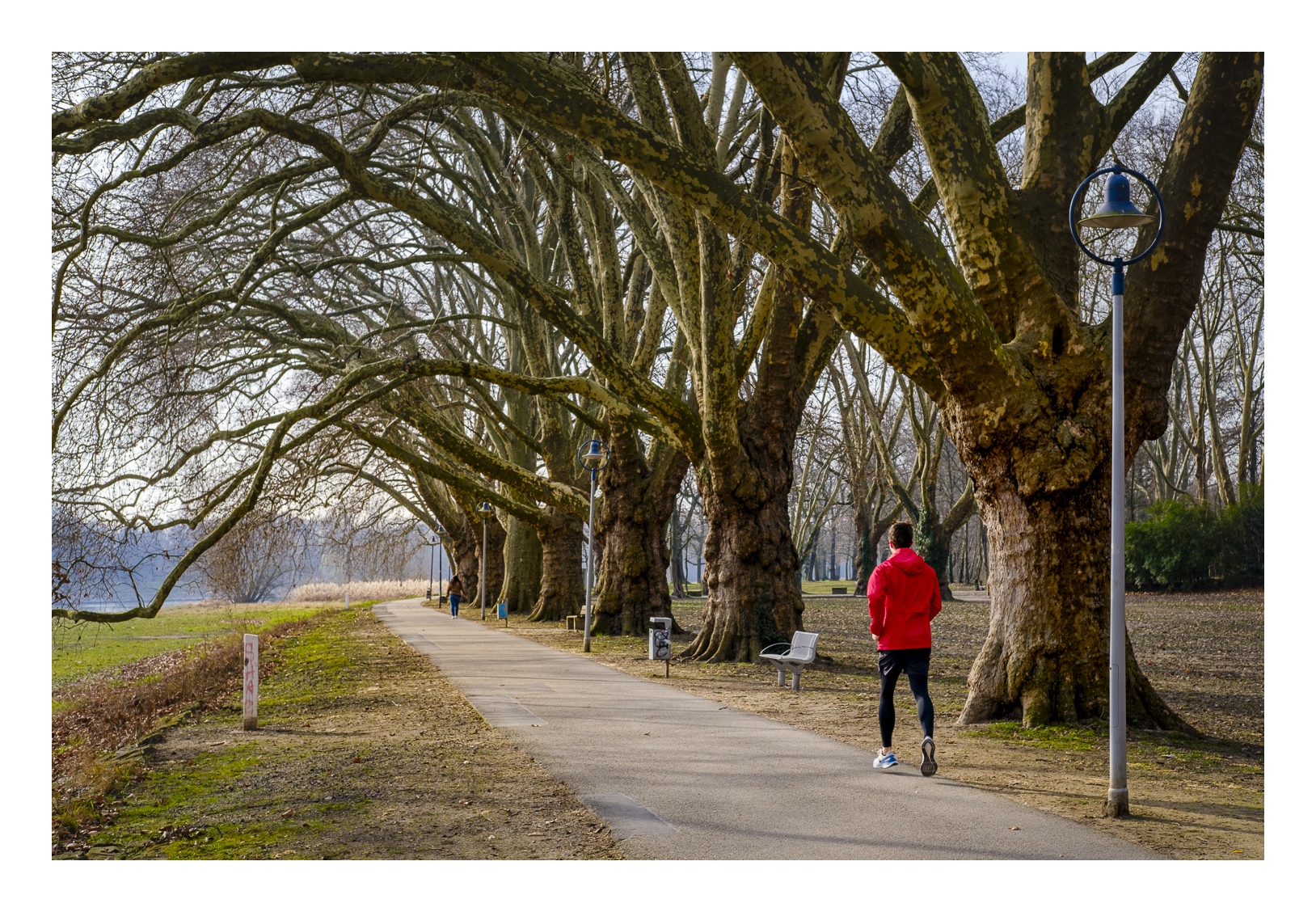 Der nördliche Teil dieser lang gestreckten Insel zwischen dem Luitpoldhafen und dem Rhein hat einen ganz anderen Charakter als der südliche, den wir vor 14 Tagen besucht hatten. Er wird dominiert von einer Platanen-Allee mit wirklich beeindruckenden alten Bäumen. Ganz am nördlichen Ende der Insel steht die „Schneckenudelbrick“, eine ca. 60 Meter lange Fußgängerbrücke über das Hafenbecken mit ihren typischen, spiralförmigen Aufgängen.