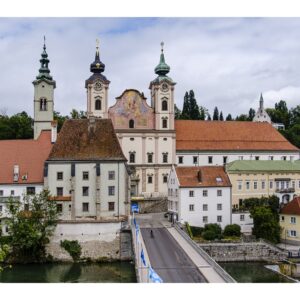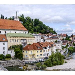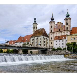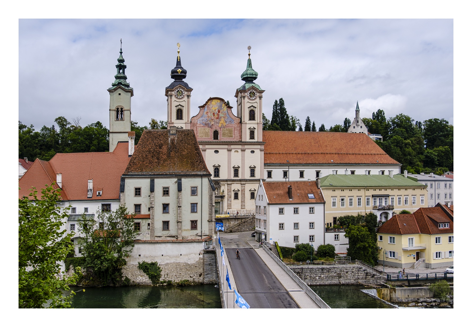 Die 38.000-Einwohner-Stadt ist unbedingt einen Besuch wert. Durch ihre Lage an der österreichischen Eisenstraße gab es hier schon in der Römerzeit einen Militärstützpunkt. Im Mittelalter entwickelte sich Steyr zu einem bedeutenden Handelsplatz, besonders für den Eisenhandel mit Venedig. Die ovale, lang gestreckte Altstadt mit dem zentralen Stadtplatz besticht durch ein besonders stimmiges Ensemble gut erhaltener historischer Gebäude. Schmale Gassen führen hinunter zum Ufer der Enns und bergauf zum Schloss Lamberg mit seinem großzügigen Schlosspark. Unmittelbar nördlich der Innenstadt mündet die Steyr über zwei breite, etwa einen Meter hohe Stufen in die Enns. Gegenüber befindet sich der sehenswerte Stadtteil „Wehrgraben“ mit dem Museum „Arbeitswelt“, der Fachhochschule und einem umfangreichen Bestand an historischen Gebäuden. Besonders stimmungsvoll ist der „Dunkelhof“, Wirkungsstätte der Malerin und Bildhauerin Dora Dunkel.