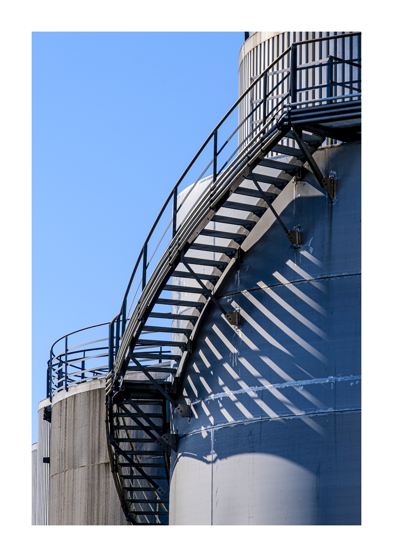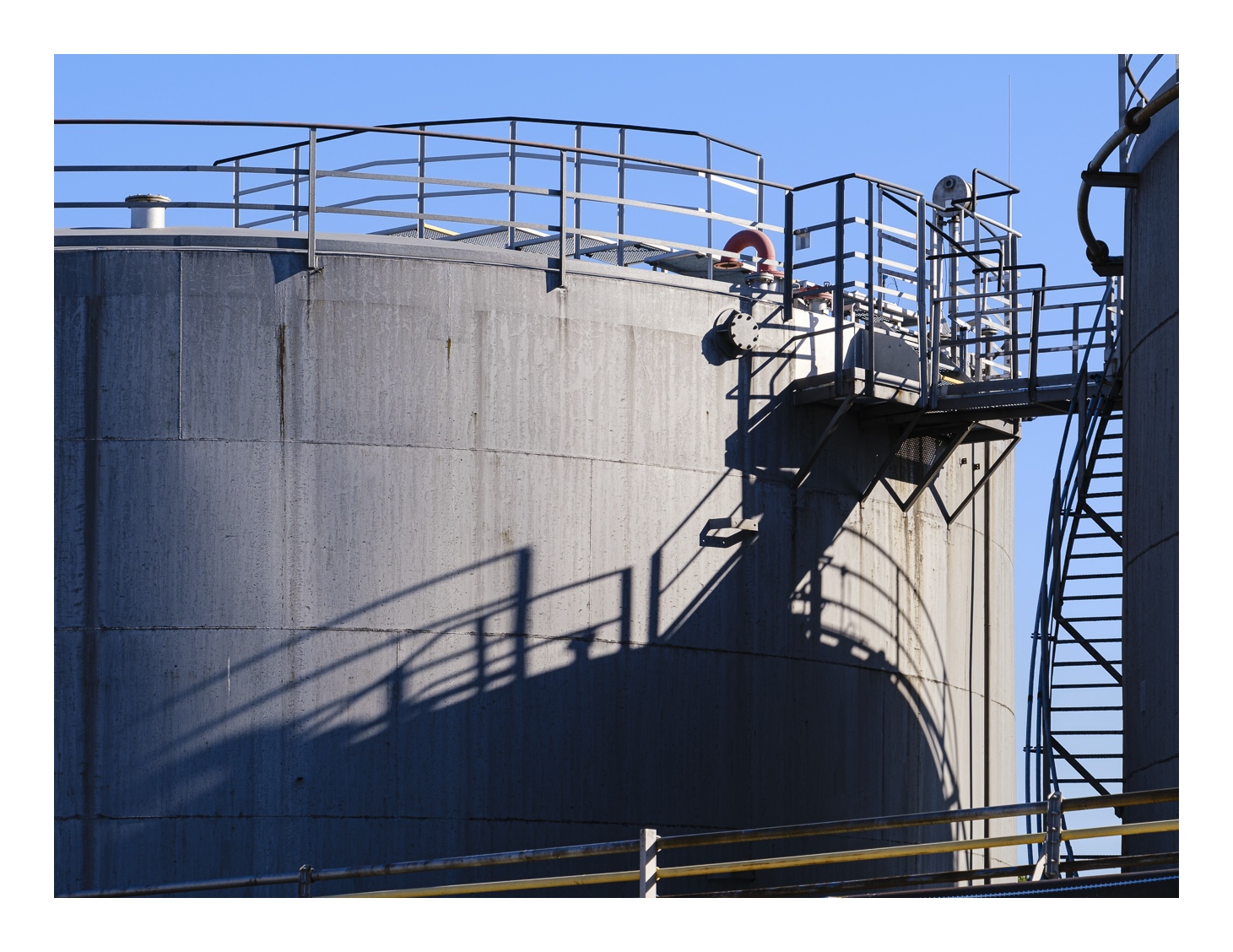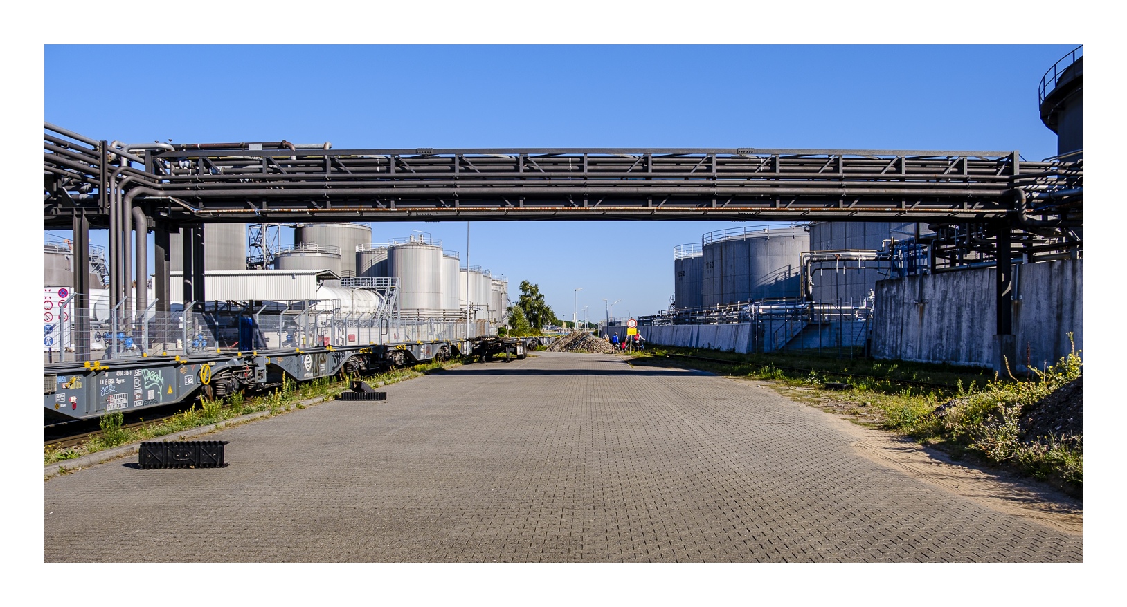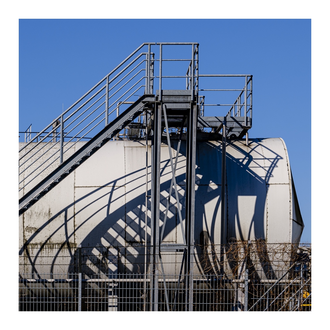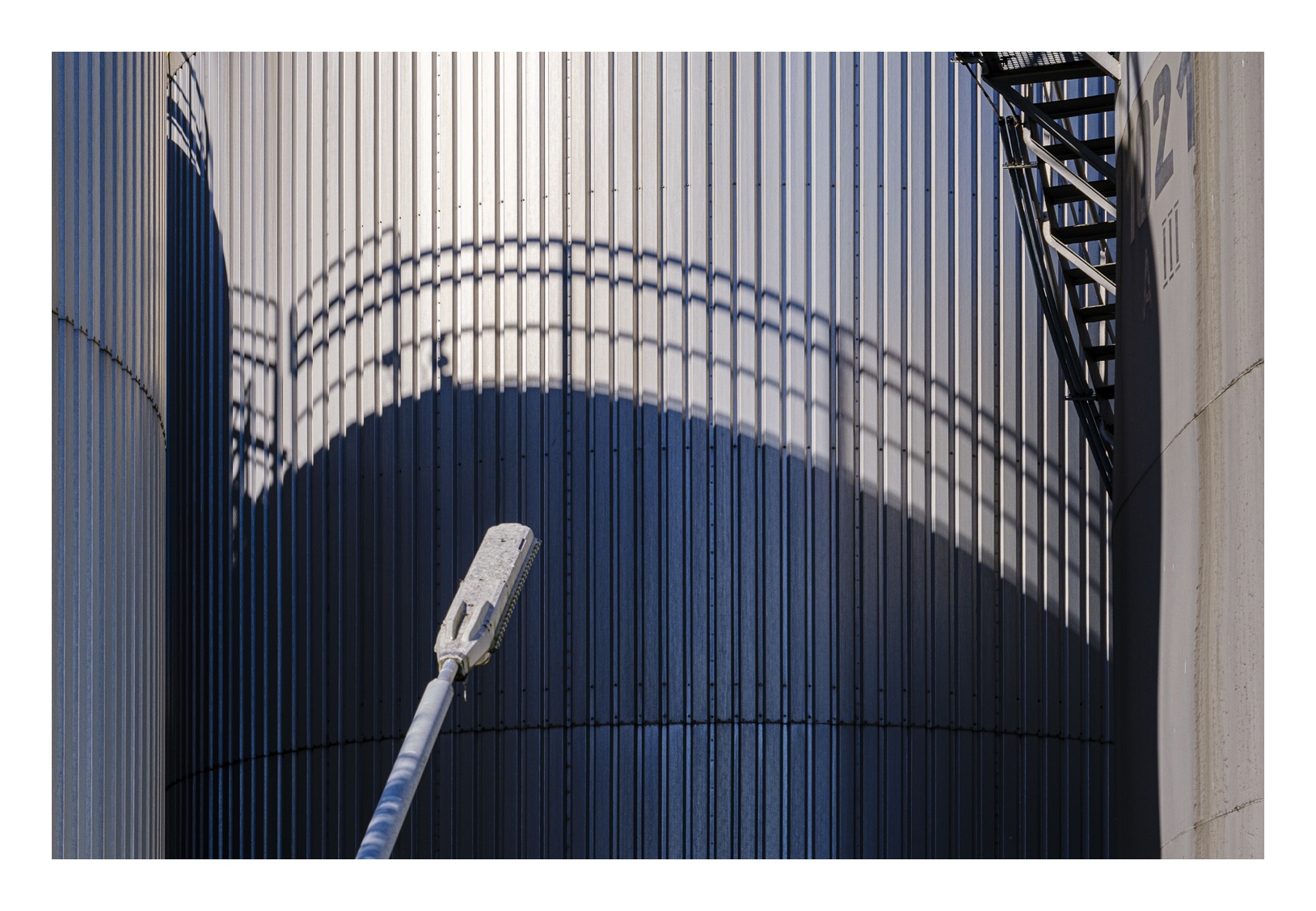 Der Weg von unserem Parkplatz bei der Wasserschutzpolizei bis zu dem besagten Punkt ist nur ein paar hundert Meter lang, aber auf denen gibt es eine Menge zu sehen und zu fotografieren, vor allem riesige Tanklager, die noch ziemlich neu aussehen. Die Sonne bescherte uns interessante Lichteffekte und harte Schatten auf den glänzenden Oberflächen der riesigen Tanks. Das habe wir natürlich fleißig ausgenutzt. Ich muss zugeben, dass meine Erwartungen an die fotografische Ergiebigkeit dieses Standortes weit übertroffen wurden und so habe ich viel mehr Bilder gemacht, als ich ursprünglich vorhatte. Zu Hause am Computer hat sich das Ganze dann etwas relativiert, denn vieles erschien mir doch zu wenig aussagekräftig. Trotzdem – es war eine interessante kleine Tour und eine gute Ergänzung unserer Unternehmung vom Freitag.