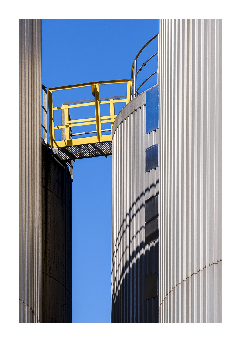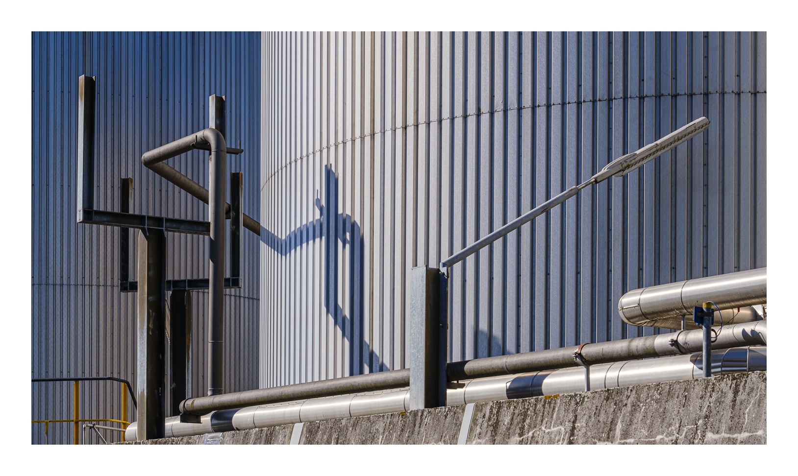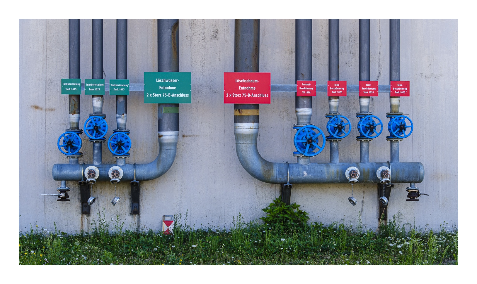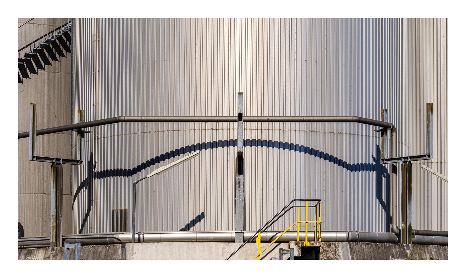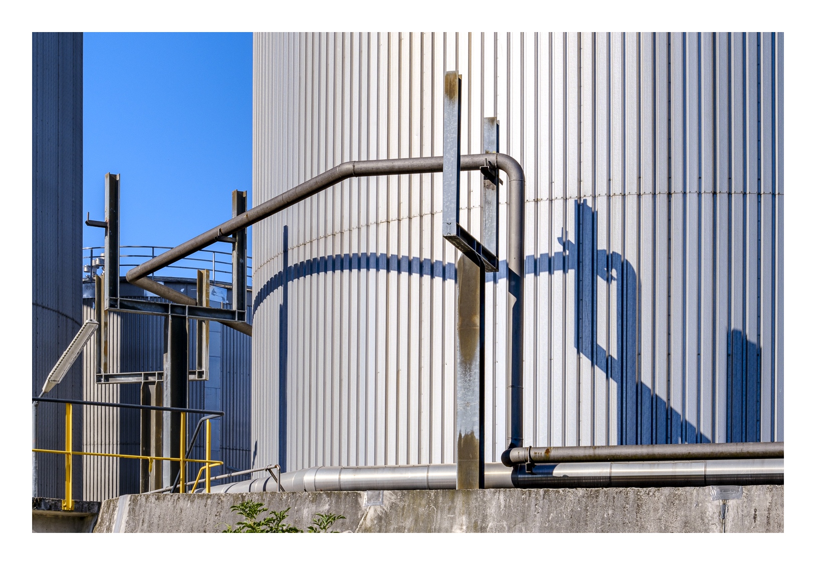 Der Weg von unserem Parkplatz bei der Wasserschutzpolizei bis zu dem besagten Punkt ist nur ein paar hundert Meter lang, aber auf denen gibt es eine Menge zu sehen und zu fotografieren, vor allem riesige Tanklager, die noch ziemlich neu aussehen. Die Sonne bescherte uns interessante Lichteffekte und harte Schatten auf den glänzenden Oberflächen der riesigen Tanks. Das habe wir natürlich fleißig ausgenutzt. Ich muss zugeben, dass meine Erwartungen an die fotografische Ergiebigkeit dieses Standortes weit übertroffen wurden und so habe ich viel mehr Bilder gemacht, als ich ursprünglich vorhatte. Zu Hause am Computer hat sich das Ganze dann etwas relativiert, denn vieles erschien mir doch zu wenig aussagekräftig. Trotzdem – es war eine interessante kleine Tour und eine gute Ergänzung unserer Unternehmung vom Freitag.