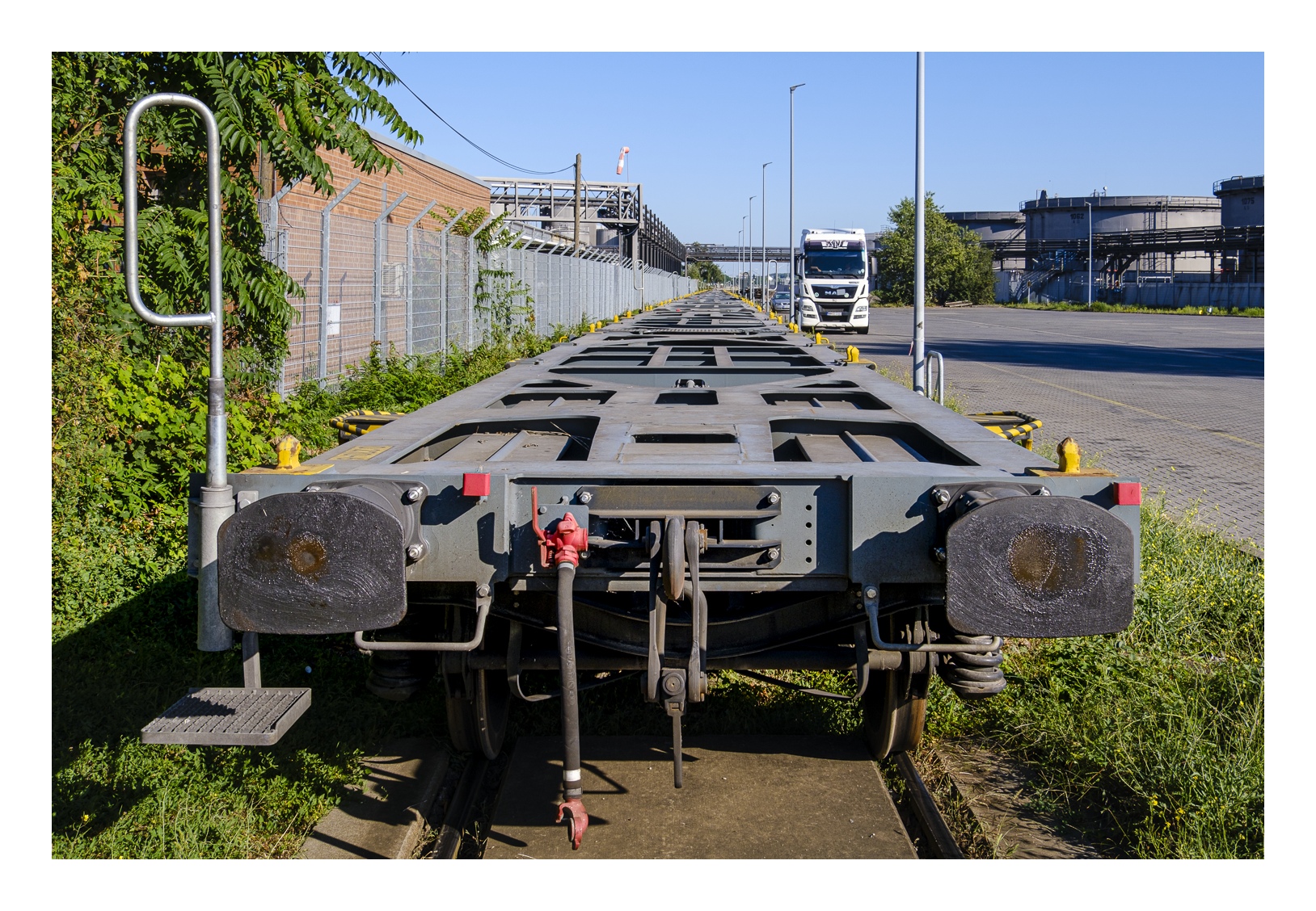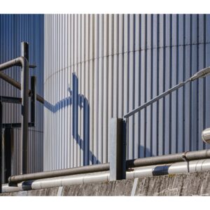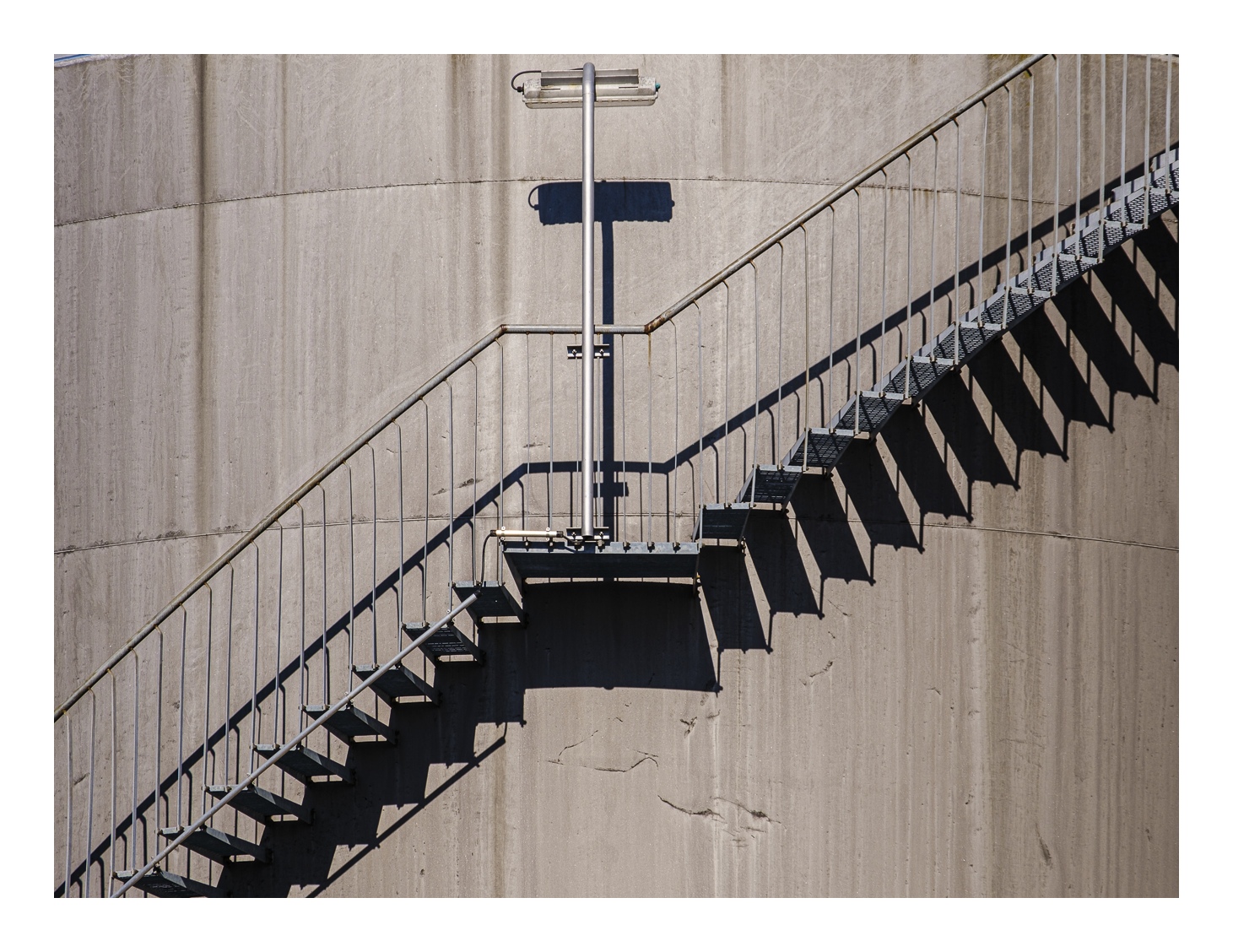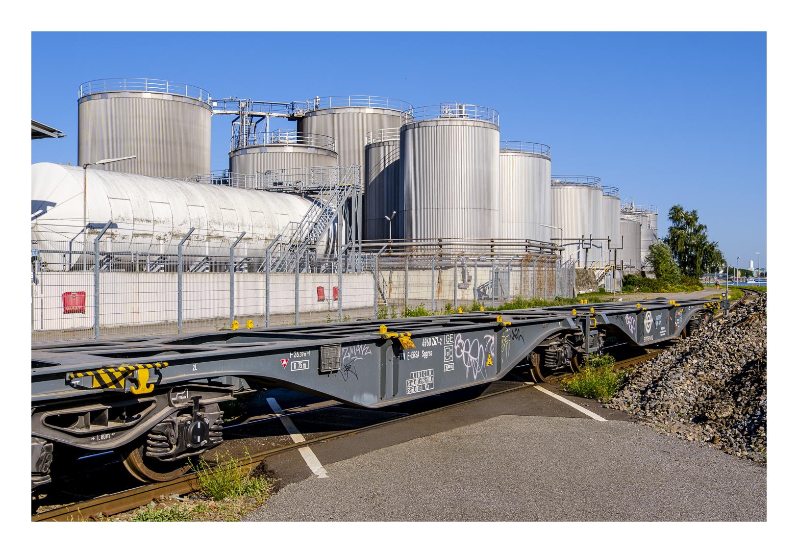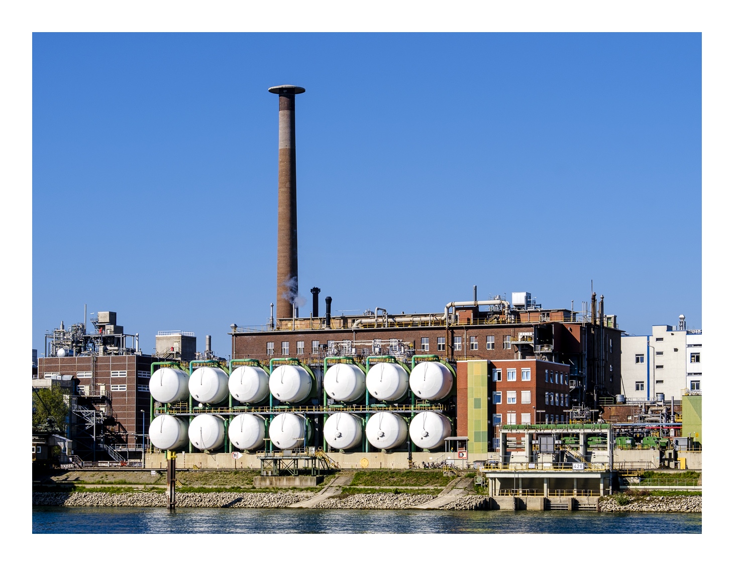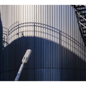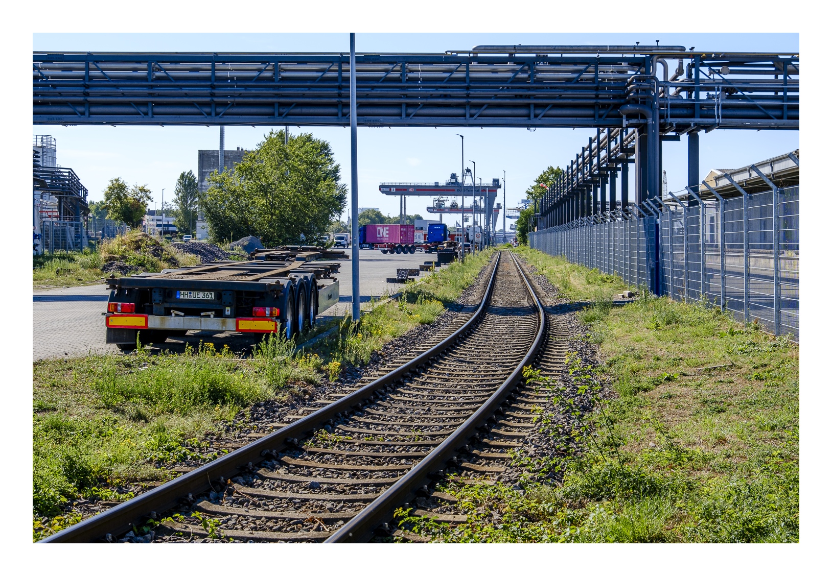 Der Weg von unserem Parkplatz bei der Wasserschutzpolizei bis zu dem besagten Punkt ist nur ein paar hundert Meter lang, aber auf denen gibt es eine Menge zu sehen und zu fotografieren, vor allem riesige Tanklager, die noch ziemlich neu aussehen. Die Sonne bescherte uns interessante Lichteffekte und harte Schatten auf den glänzenden Oberflächen der riesigen Tanks. Das habe wir natürlich fleißig ausgenutzt. Ich muss zugeben, dass meine Erwartungen an die fotografische Ergiebigkeit dieses Standortes weit übertroffen wurden und so habe ich viel mehr Bilder gemacht, als ich ursprünglich vorhatte. Zu Hause am Computer hat sich das Ganze dann etwas relativiert, denn vieles erschien mir doch zu wenig aussagekräftig. Trotzdem – es war eine interessante kleine Tour und eine gute Ergänzung unserer Unternehmung vom Freitag.