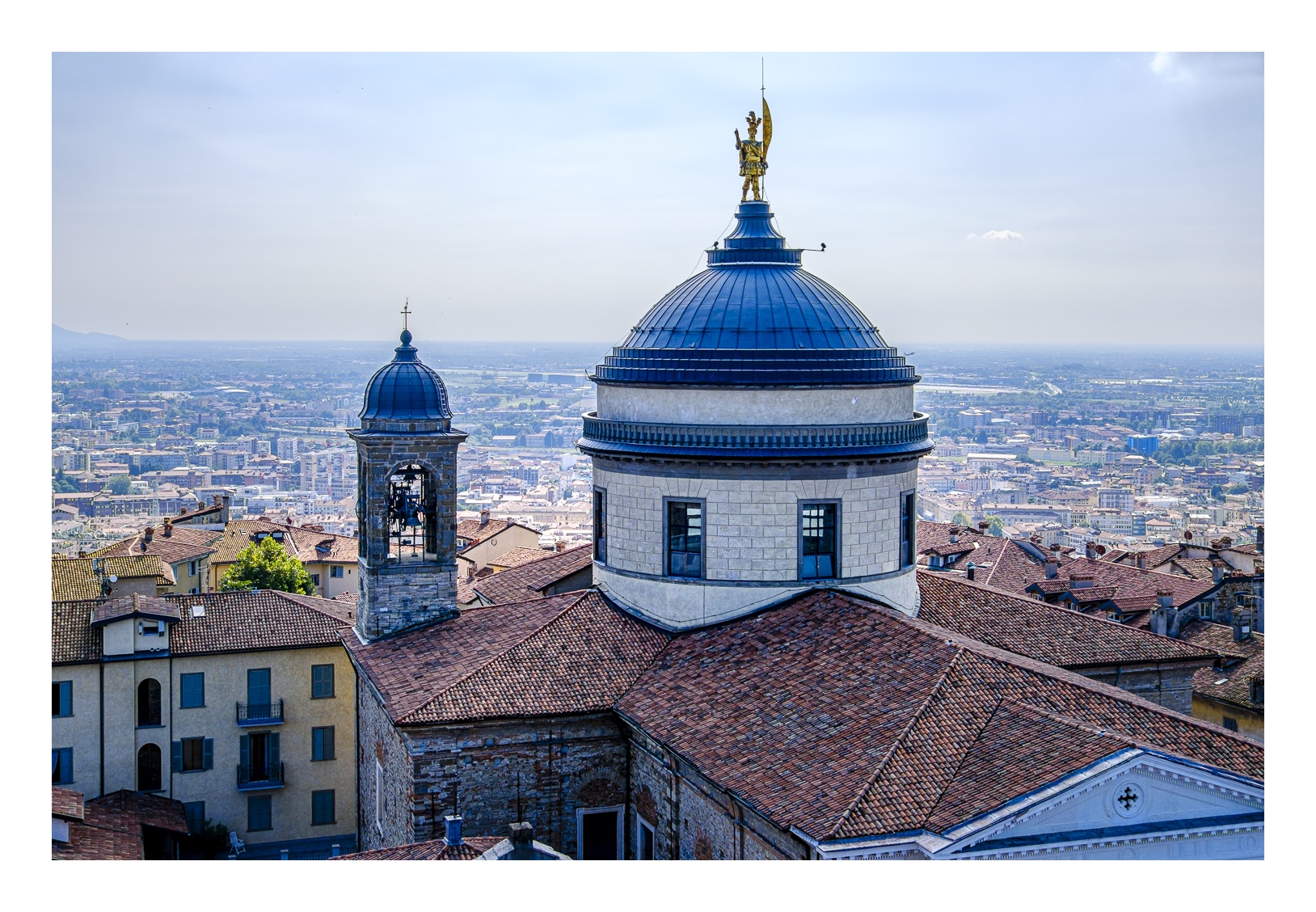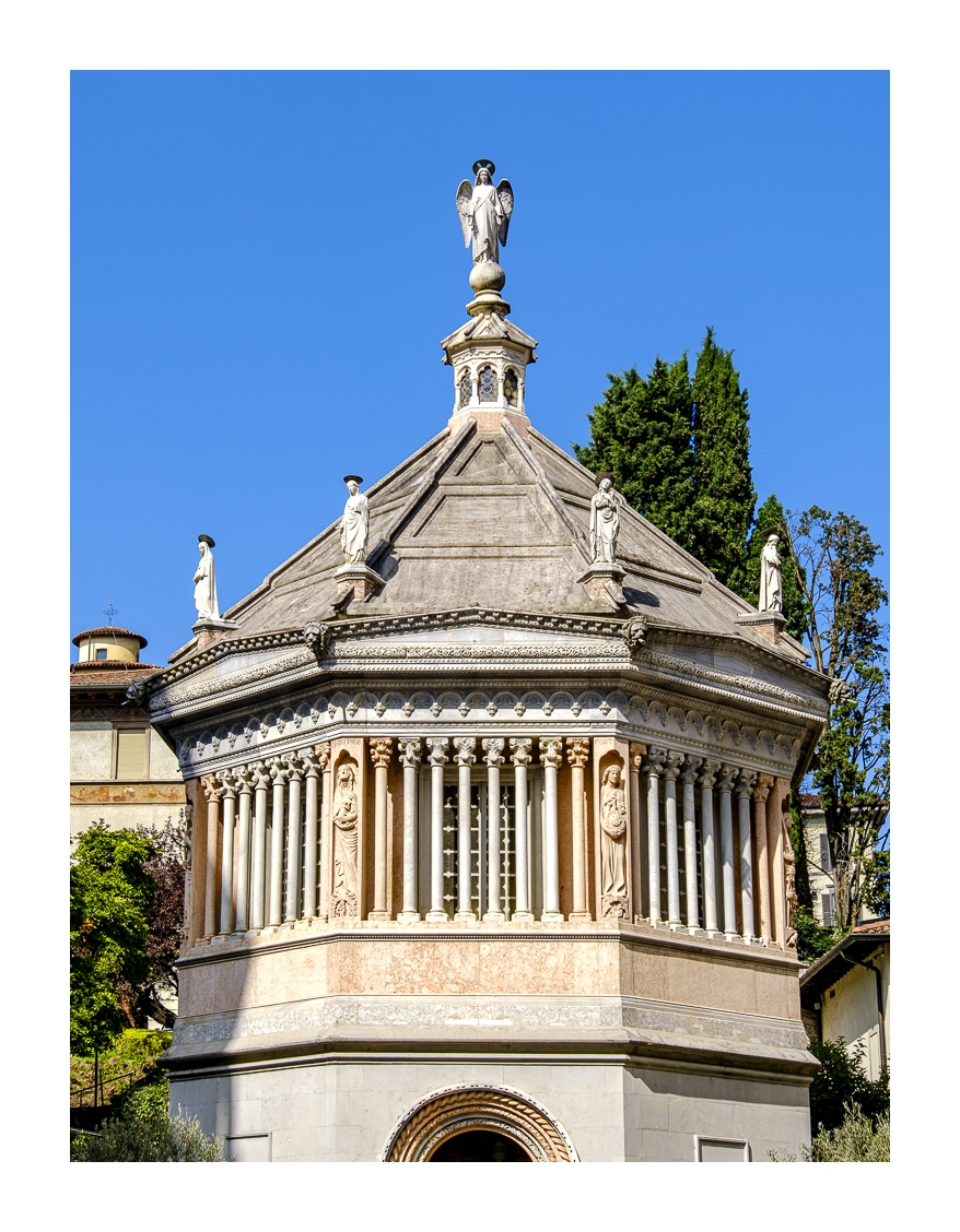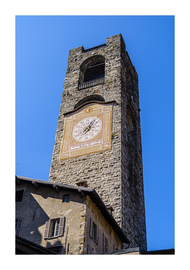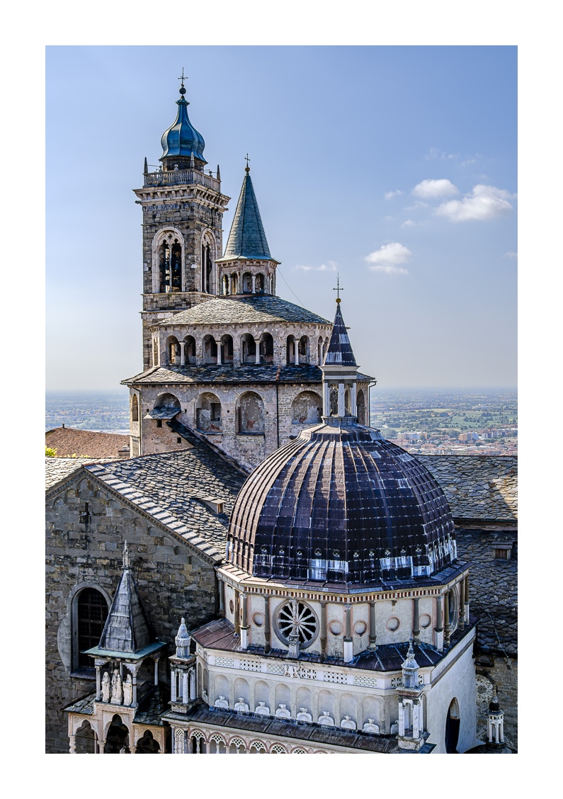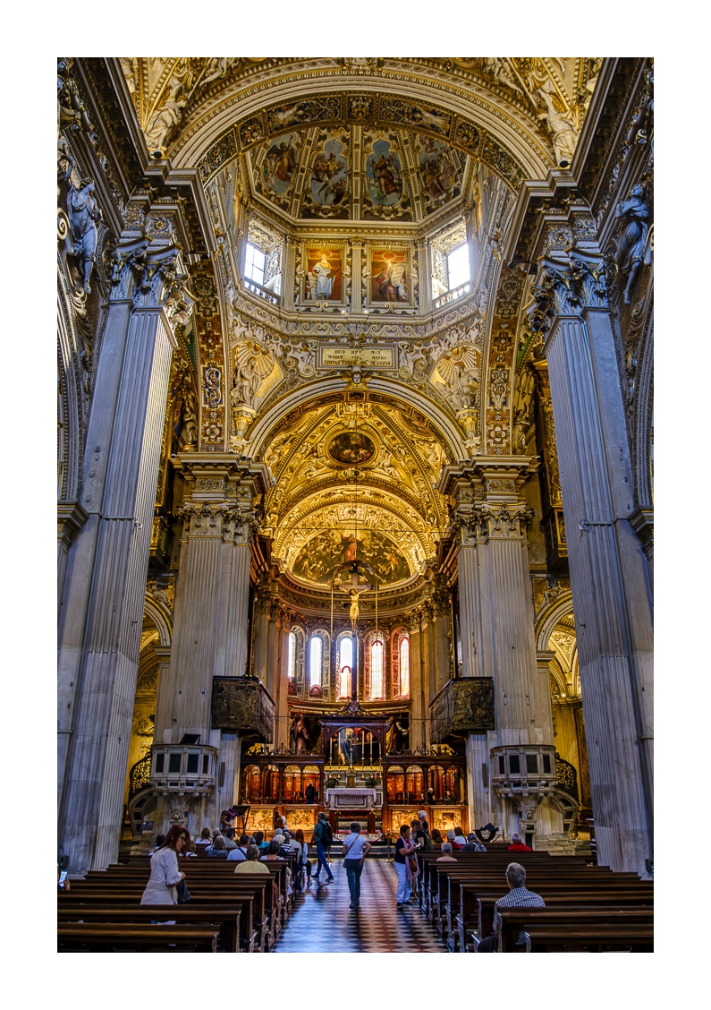Hoch über der Unterstadt liegt – deutlich abgesetzt – auf einem breiten Felsplateau die mittelalterliche Altstadt, die von einer 5 km langen, vollständig erhaltenen Mauer aus venezianischer Zeit umgeben ist. Wobei „Plateau“ nicht ganz der treffende Ausdruck ist, denn auch in der Altstadt gibt es ganz schöne Höhenunterschiede. Von der Unterstadt führt eine ziemlich stark frequentierte Standseilbahn nach oben. Man kann aber auch den Bus nehmen oder zu Fuß gehen, was allerdings kein lockerer Spaziergang ist. Die Altstadt wirkt eher museal, verfügt aber über ein schönes Angebot von kleinen Geschäften und Restaurants. Im Zentrum liegen der „Piazza Vecchia“ mit dem prächtigen Rathaus und der benachbarte „Piazza del Duomo“ mit dem Dom und weiteren Sakralbauten. Dazwischen steht der Stadtturm, den man unbedingt besteigen sollte, um die einmalige Aussicht zu genießen. Der von außen eher unscheinbare Dom erstrahlt in seinem Inneren in einer unfassbaren goldenen Pracht. Das hat mich wirklich umgehauen und in eine Art Fotorausch versetzt.