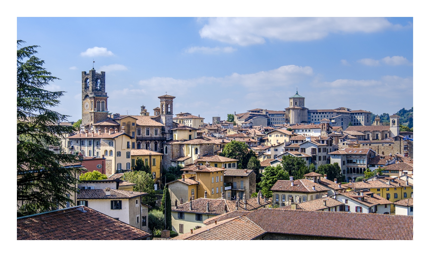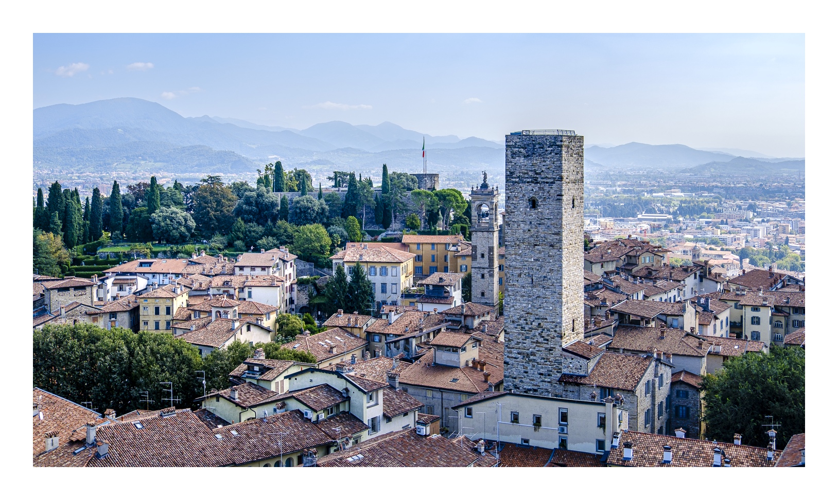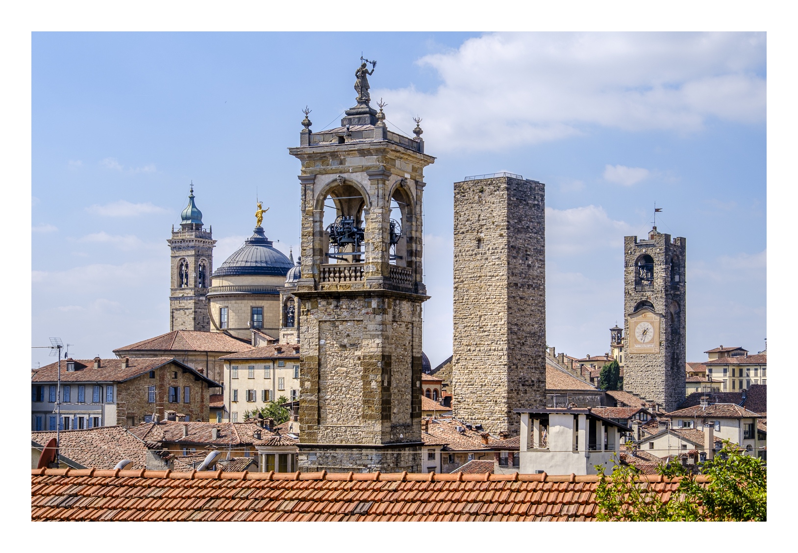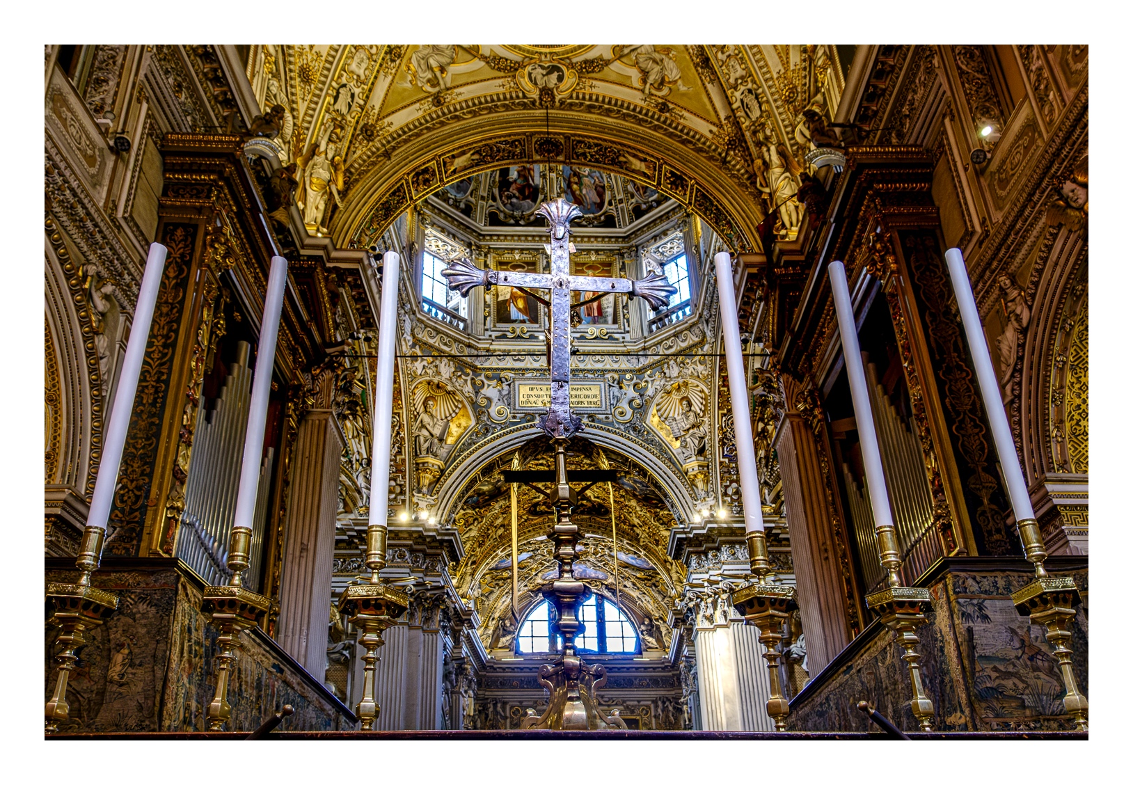Hoch über der Unterstadt liegt – deutlich abgesetzt – auf einem breiten Felsplateau die mittelalterliche Altstadt, die von einer 5 km langen, vollständig erhaltenen Mauer aus venezianischer Zeit umgeben ist. Wobei „Plateau“ nicht ganz der treffende Ausdruck ist, denn auch in der Altstadt gibt es ganz schöne Höhenunterschiede. Von der Unterstadt führt eine ziemlich stark frequentierte Standseilbahn nach oben. Man kann aber auch den Bus nehmen oder zu Fuß gehen, was allerdings kein lockerer Spaziergang ist. Die Altstadt wirkt eher museal, verfügt aber über ein schönes Angebot von kleinen Geschäften und Restaurants. Im Zentrum liegen der „Piazza Vecchia“ mit dem prächtigen Rathaus und der benachbarte „Piazza del Duomo“ mit dem Dom und weiteren Sakralbauten. Dazwischen steht der Stadtturm, den man unbedingt besteigen sollte, um die einmalige Aussicht zu genießen. Der von außen eher unscheinbare Dom erstrahlt in seinem Inneren in einer unfassbaren goldenen Pracht. Das hat mich wirklich umgehauen und in eine Art Fotorausch versetzt.