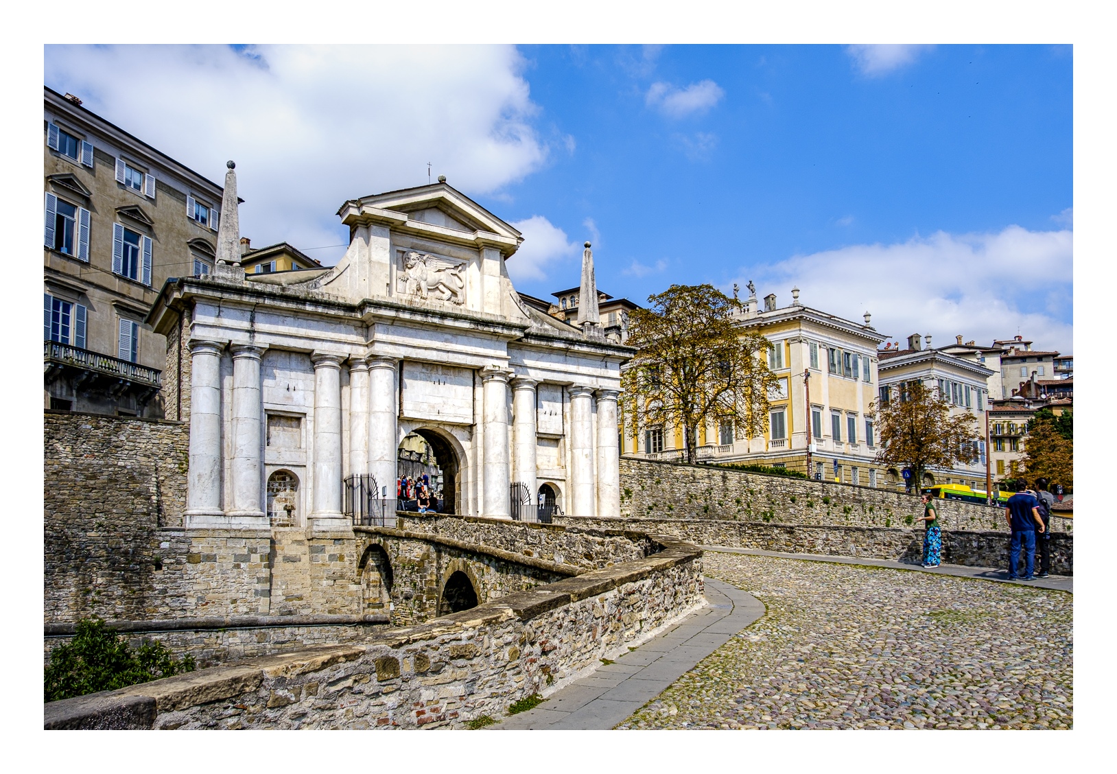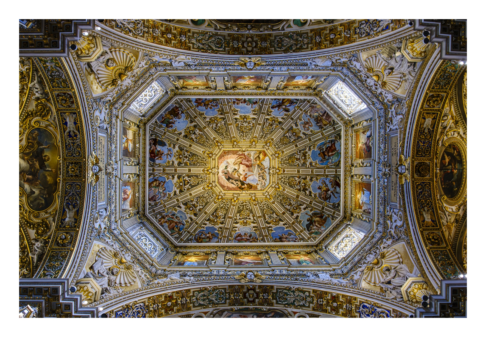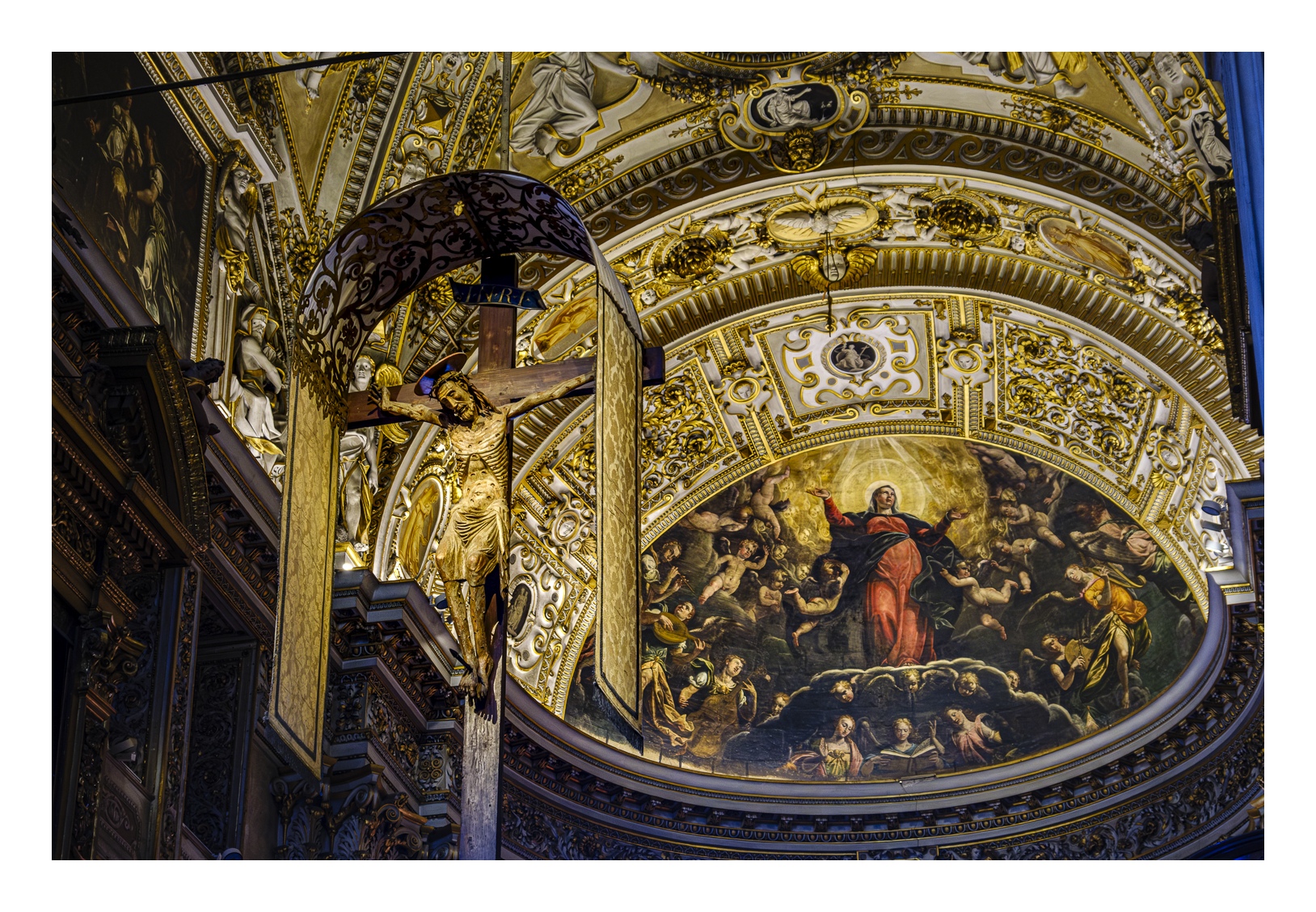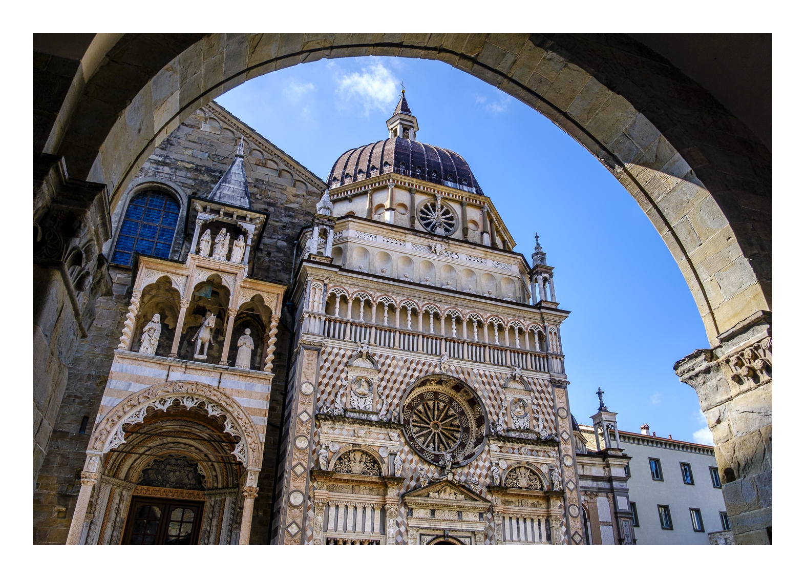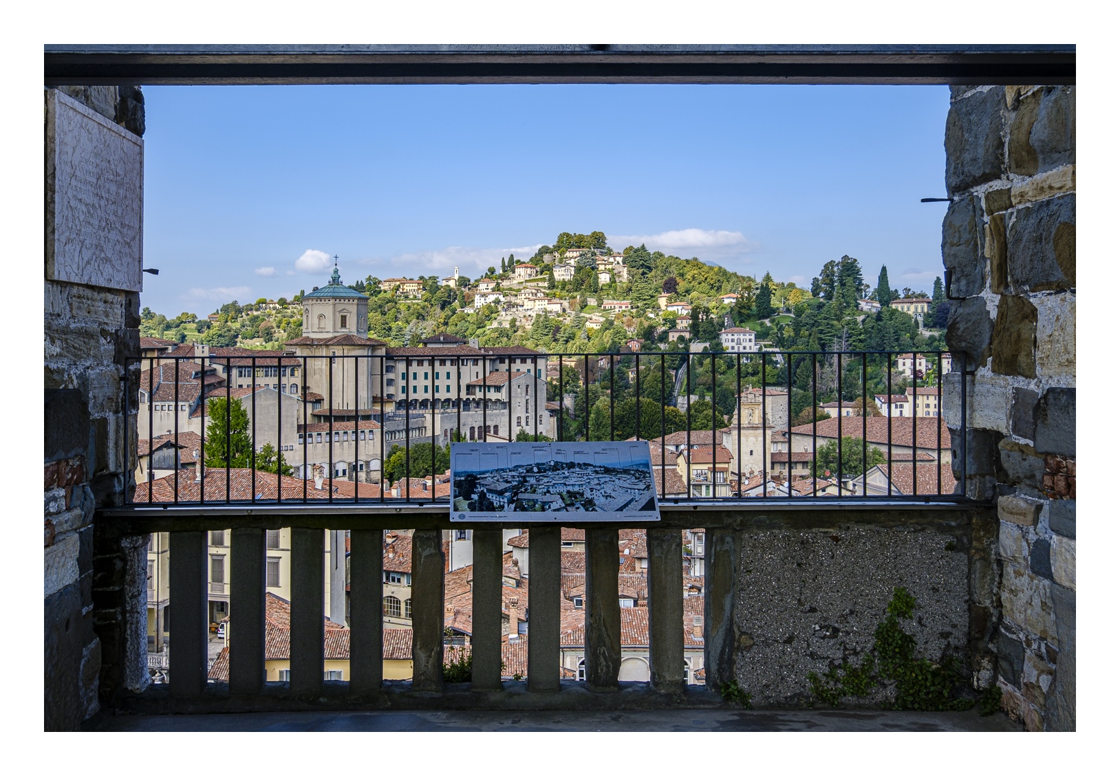 Hoch über der Unterstadt liegt – deutlich abgesetzt – auf einem breiten Felsplateau die mittelalterliche Altstadt, die von einer 5 km langen, vollständig erhaltenen Mauer aus venezianischer Zeit umgeben ist. Wobei „Plateau“ nicht ganz der treffende Ausdruck ist, denn auch in der Altstadt gibt es ganz schöne Höhenunterschiede. Von der Unterstadt führt eine ziemlich stark frequentierte Standseilbahn nach oben. Man kann aber auch den Bus nehmen oder zu Fuß gehen, was allerdings kein lockerer Spaziergang ist. Die Altstadt wirkt eher museal, verfügt aber über ein schönes Angebot von kleinen Geschäften und Restaurants. Im Zentrum liegen der „Piazza Vecchia“ mit dem prächtigen Rathaus und der benachbarte „Piazza del Duomo“ mit dem Dom und weiteren Sakralbauten. Dazwischen steht der Stadtturm, den man unbedingt besteigen sollte, um die einmalige Aussicht zu genießen. Der von außen eher unscheinbare Dom erstrahlt in seinem Inneren in einer unfassbaren goldenen Pracht. Das hat mich wirklich umgehauen und in eine Art Fotorausch versetzt.