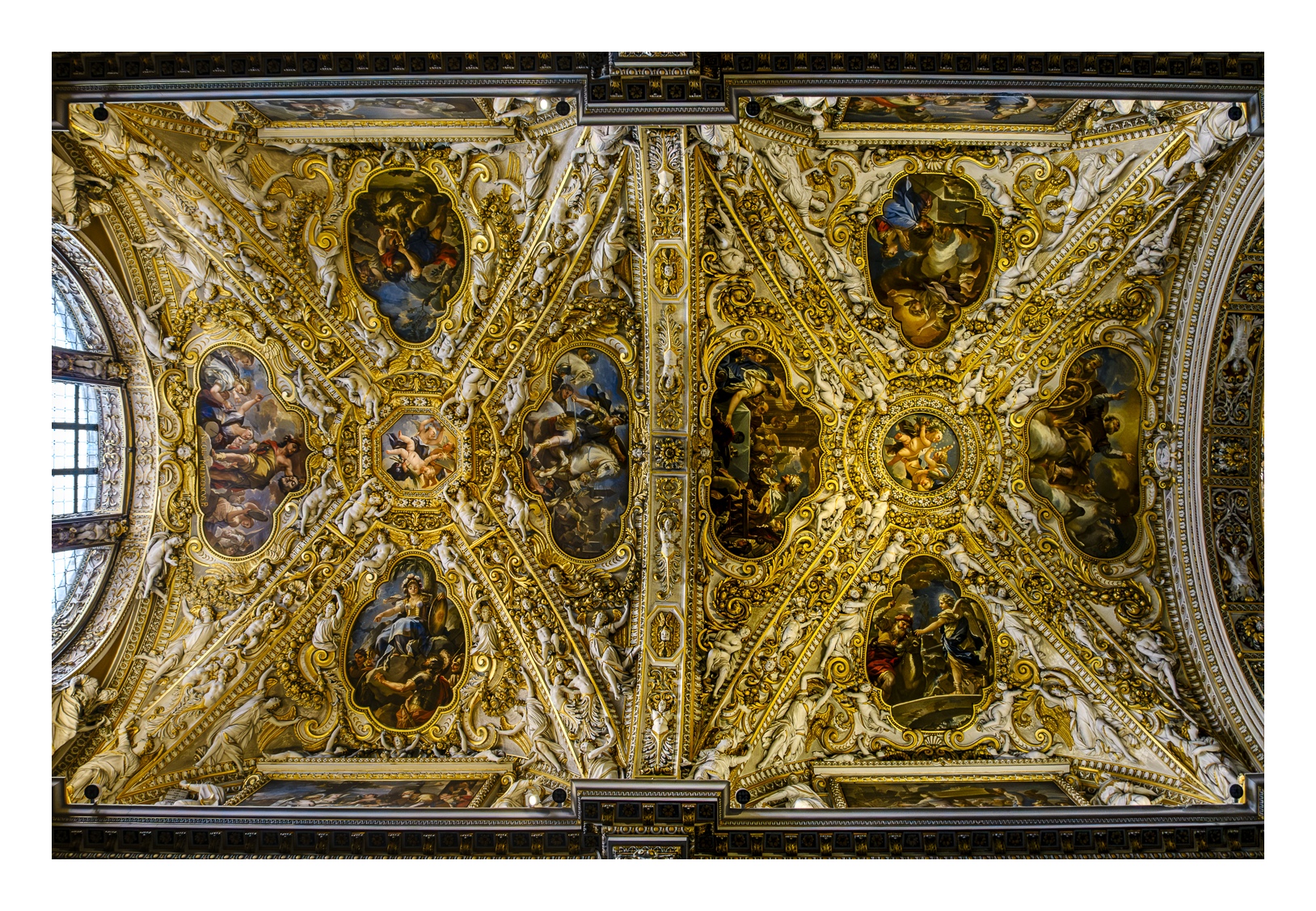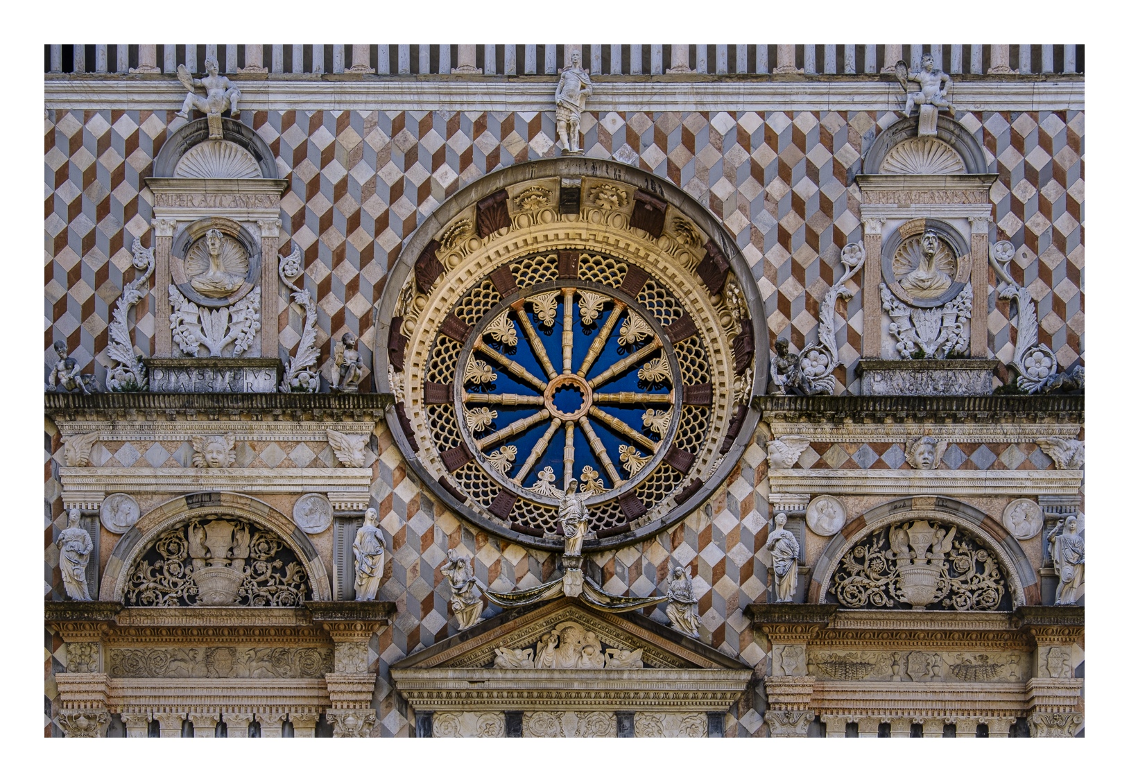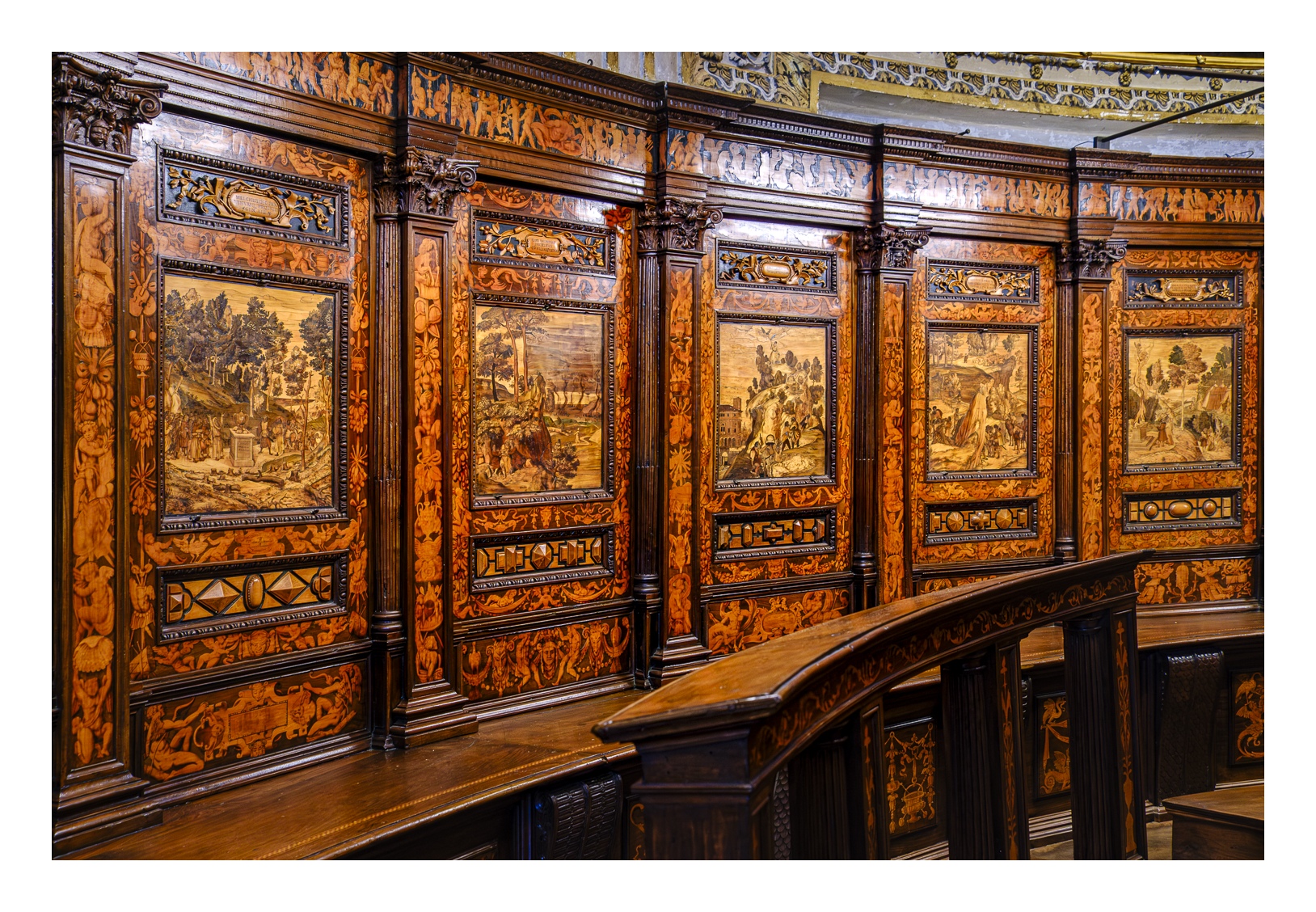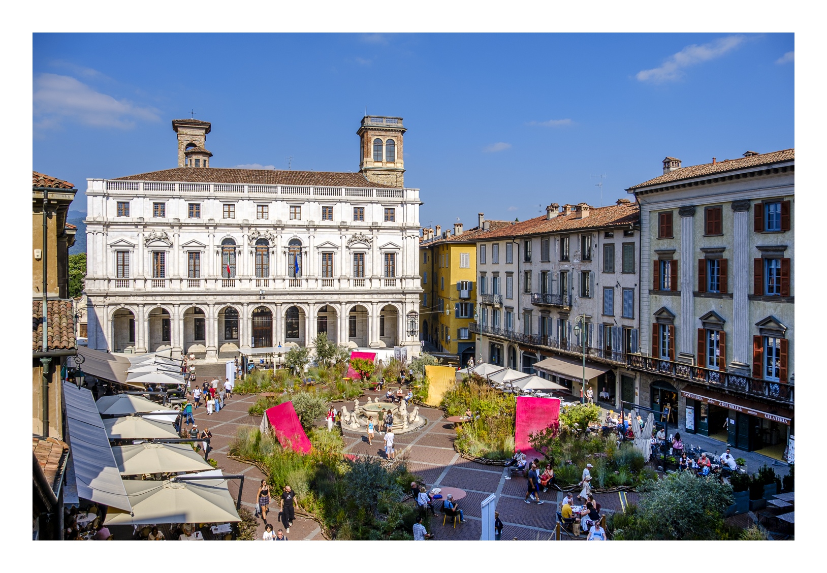 Hoch über der Unterstadt liegt – deutlich abgesetzt – auf einem breiten Felsplateau die mittelalterliche Altstadt, die von einer 5 km langen, vollständig erhaltenen Mauer aus venezianischer Zeit umgeben ist. Wobei „Plateau“ nicht ganz der treffende Ausdruck ist, denn auch in der Altstadt gibt es ganz schöne Höhenunterschiede. Von der Unterstadt führt eine ziemlich stark frequentierte Standseilbahn nach oben. Man kann aber auch den Bus nehmen oder zu Fuß gehen, was allerdings kein lockerer Spaziergang ist. Die Altstadt wirkt eher museal, verfügt aber über ein schönes Angebot von kleinen Geschäften und Restaurants. Im Zentrum liegen der „Piazza Vecchia“ mit dem prächtigen Rathaus und der benachbarte „Piazza del Duomo“ mit dem Dom und weiteren Sakralbauten. Dazwischen steht der Stadtturm, den man unbedingt besteigen sollte, um die einmalige Aussicht zu genießen. Der von außen eher unscheinbare Dom erstrahlt in seinem Inneren in einer unfassbaren goldenen Pracht. Das hat mich wirklich umgehauen und in eine Art Fotorausch versetzt.