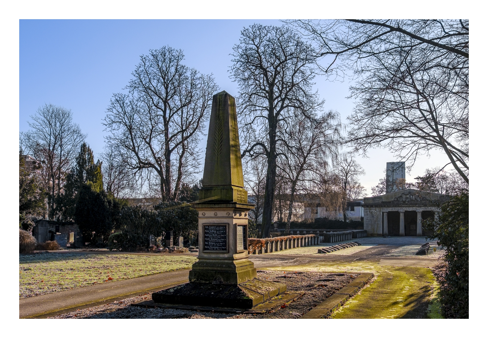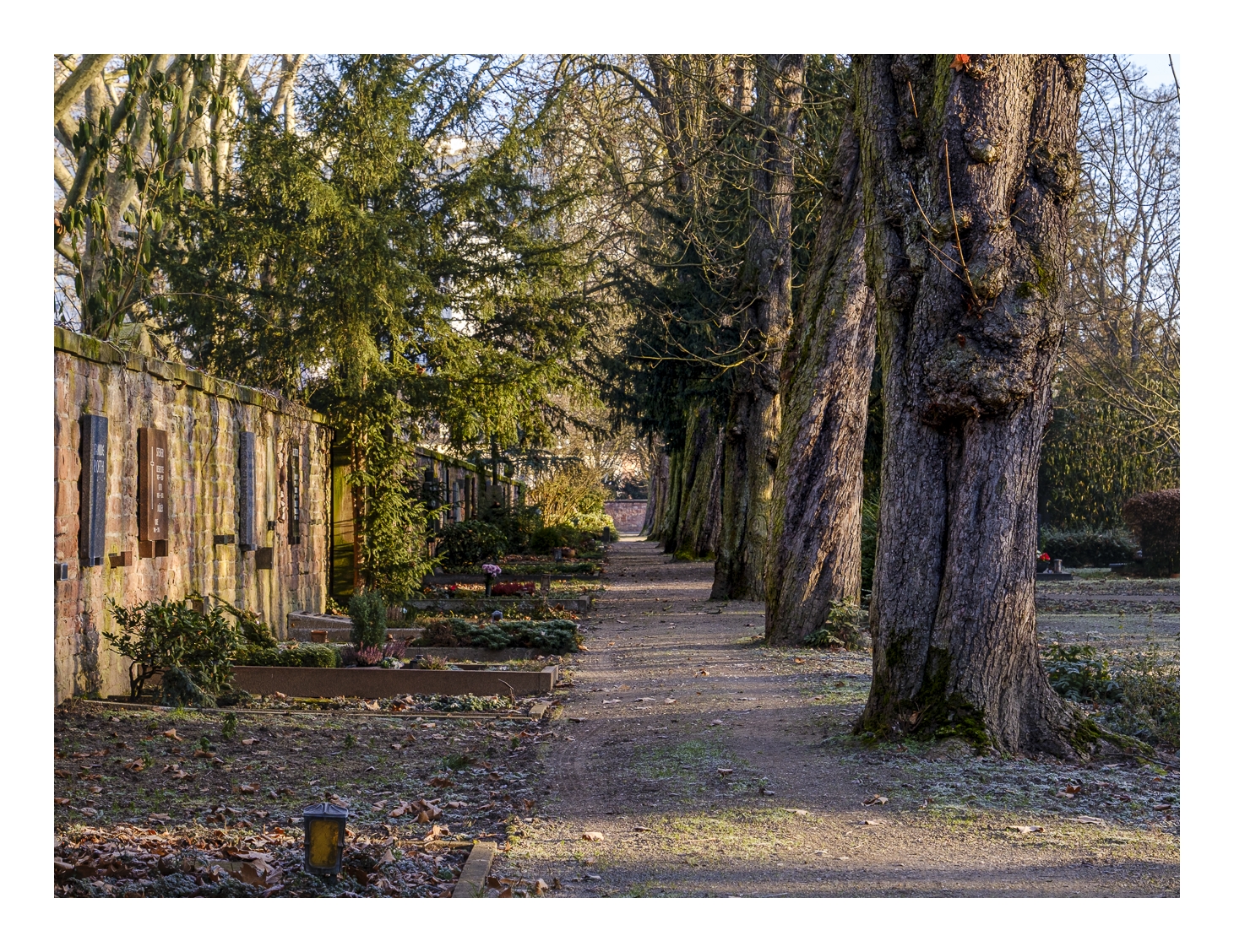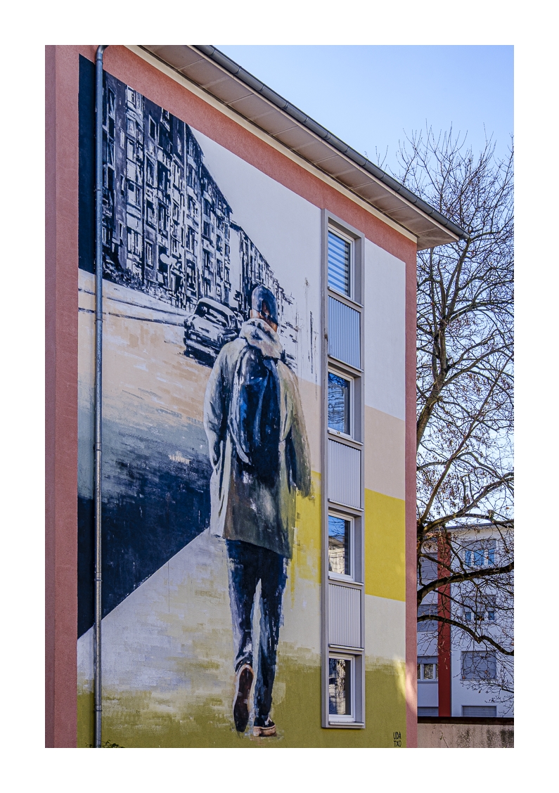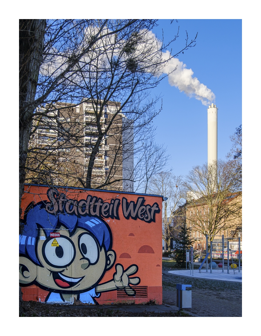 Als Gerd (www.gerd-stauder.de) und ich heute Morgen losgefahren sind, zeigte mein Auto-Thermometer -3 Grad. Obwohl die Sonne heraus kam und uns einen strahlend blauen Himmel bescherte, blieb die Temperatur den ganzen Tag unter dem Gefrierpunkt. Aber das hat uns nicht abgeschreckt. Wir sind zum gleichen Punkt gefahren wie letzte Woche (alter Schlachthof), diesmal aber in die entgegengesetzte Richtung spaziert. Zunächst ging es quer über den Hauptfriedhof bis zur Frankenthaler Straße und dann durch das sog. Schlachthof-Viertel wieder zurück zum Auto. Trotz der Kälte waren wir über anderthalb Stunden unterwegs und am Ende einigermaßen durchgefroren. Dann wurde es Zeit für die obligatorische Nachbesprechung im Café.