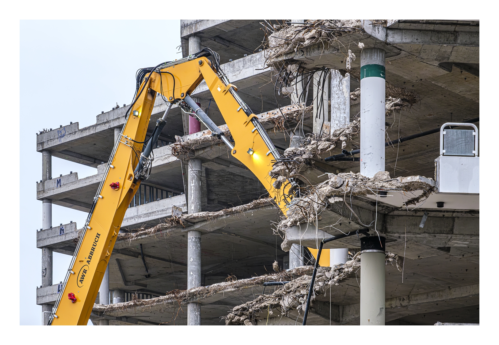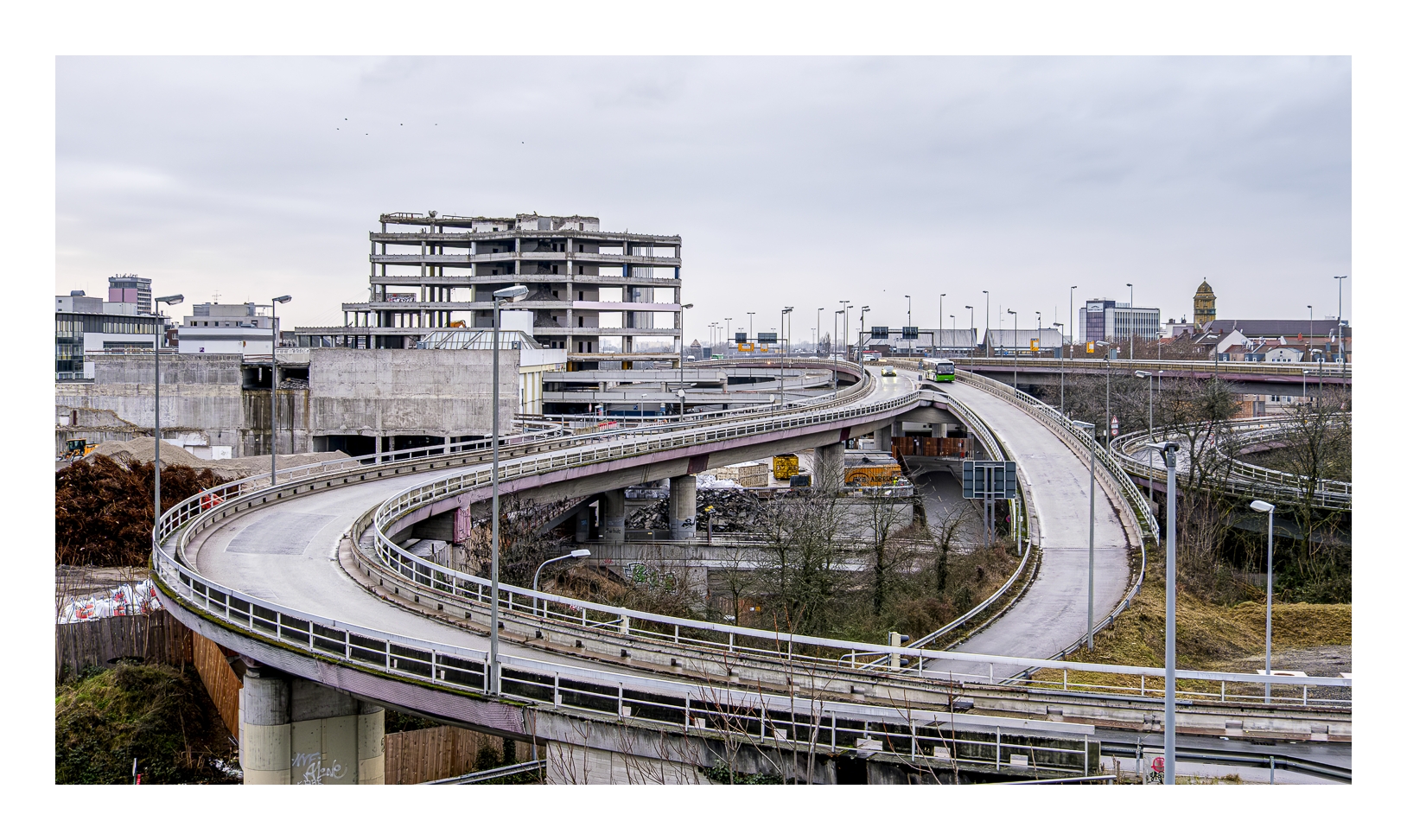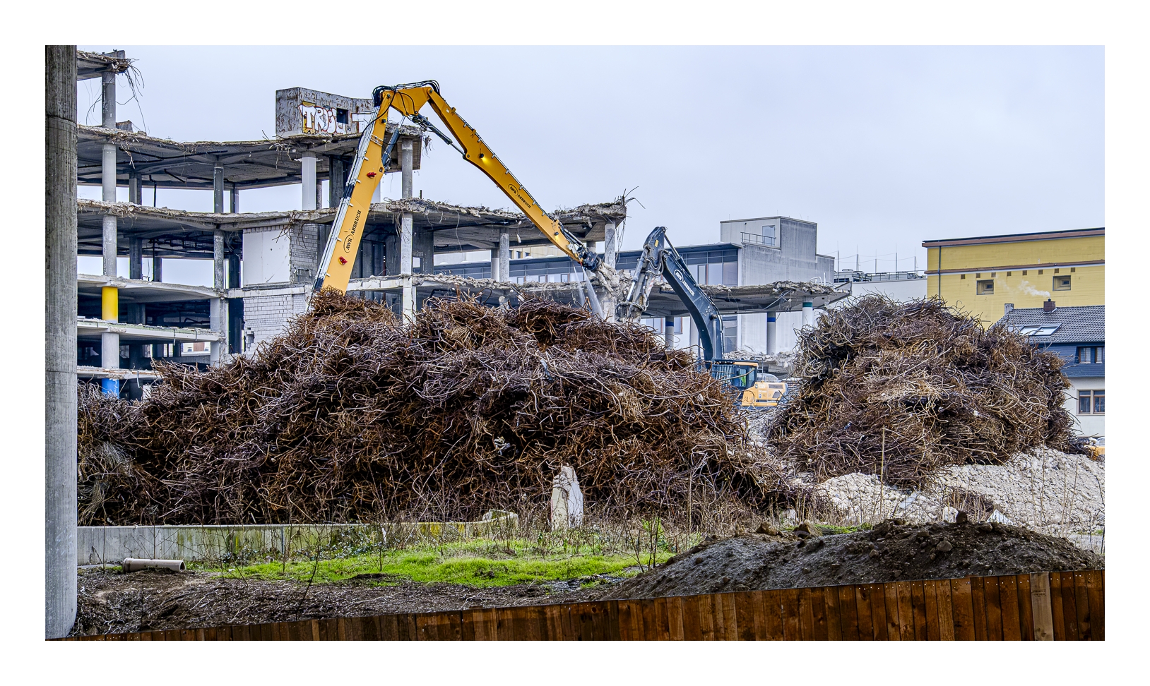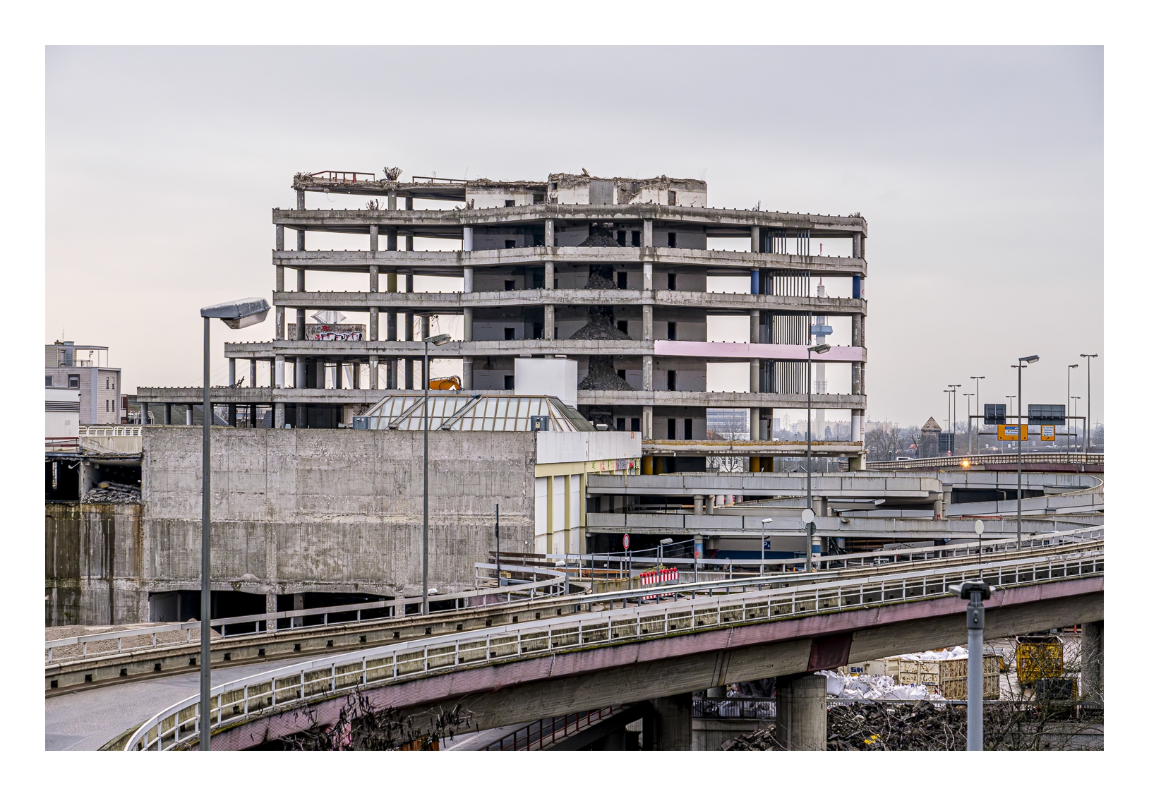 Schon wieder trübes und regnerisches Wetter! Wir wollten trotzdem rausfahren und fotografieren. Gerd (www.gerd-stauder.de) hatte die Idee, mal wieder die Rauhaus-Center-Baustelle in der Ludwigshafener Innenstadt ins Auge zu fassen. Dieses ehemalige Wahrzeichen der Stadt muss nämlich der neuen Stadtstraße weichen und der Abriss ist mittlerweile ziemlich weit fortgeschritten. Ich habe schon mehrfach Bilder von dieser Großbaustelle gezeigt (-> klick, -> klick …).