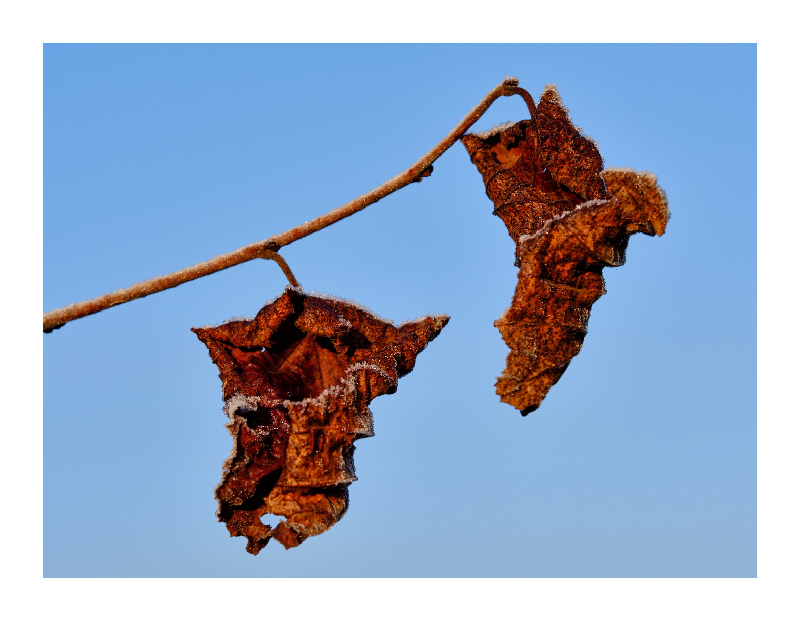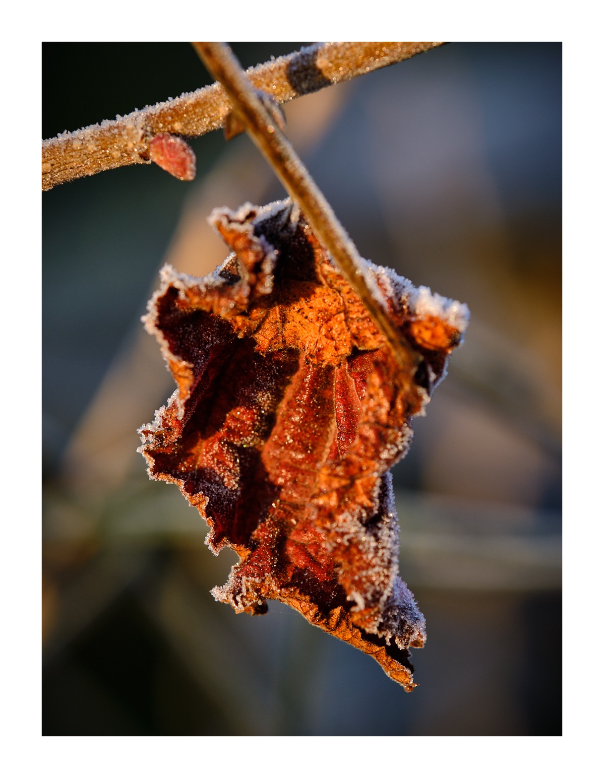 Am Freitagmorgen wollten Gerd (www.gerd-stauder.de) und ich eigentlich ein halb verfallenes Gewächshaus fotografieren. Aber leider war alles abgesperrt und somit kein Thema für uns. Zum Glück hatten wir die Makro-Objektive dabei. Die haben wir genutzt, um einen kleinen Spaziergang zu unternehmen und ein paar ganz unscheinbare Motive am Wegesrand einzufangen, die man eigentlich oft übersieht. Zum Teil waren die Blätter und Äste noch mit dickem Raureif überzogen. Aber die Sonne kam heraus und im Handumdrehen war die Pracht auch schon dahingeschmolzen.