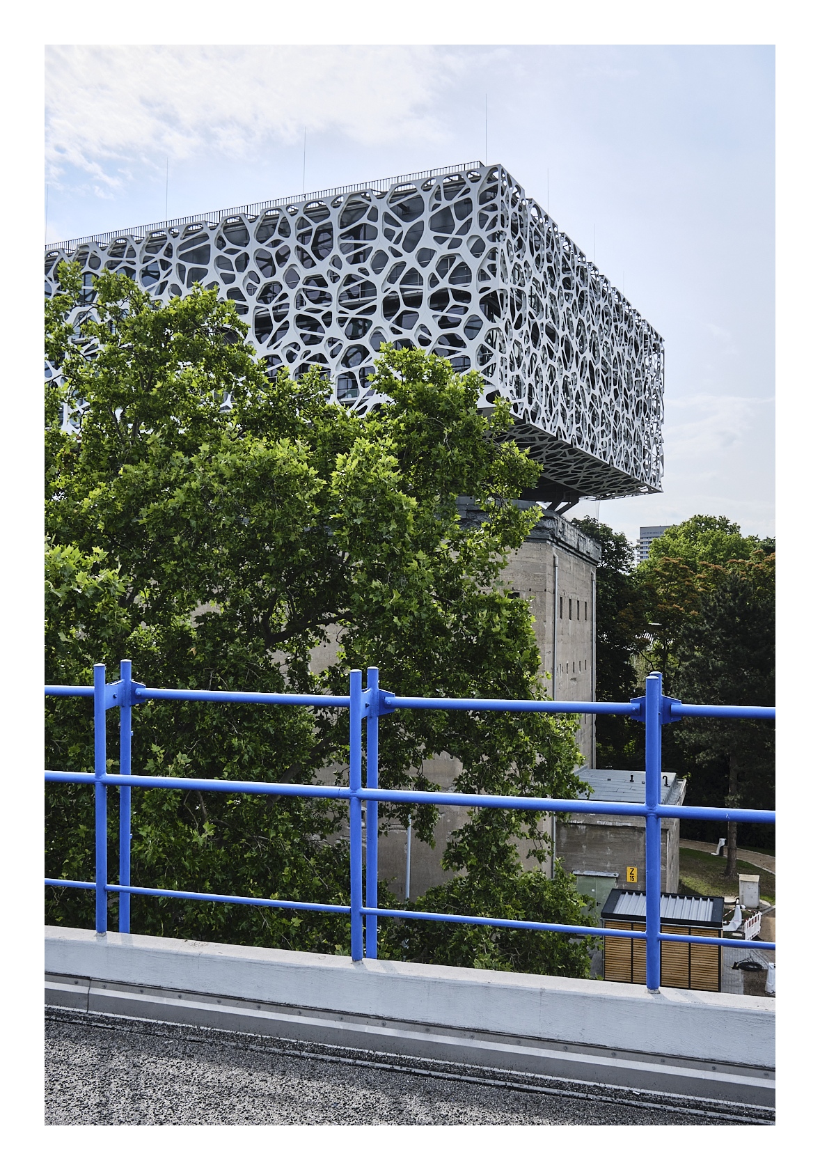 In der Symbiose mit dem Bunker unterstreicht sie den Kontrast aus der fragilen, leichten, geöffneten Konstruktion auf dem sehr schweren, geschlossenen, abweisenden Bunker. Und setzt sich damit deutlich ab.