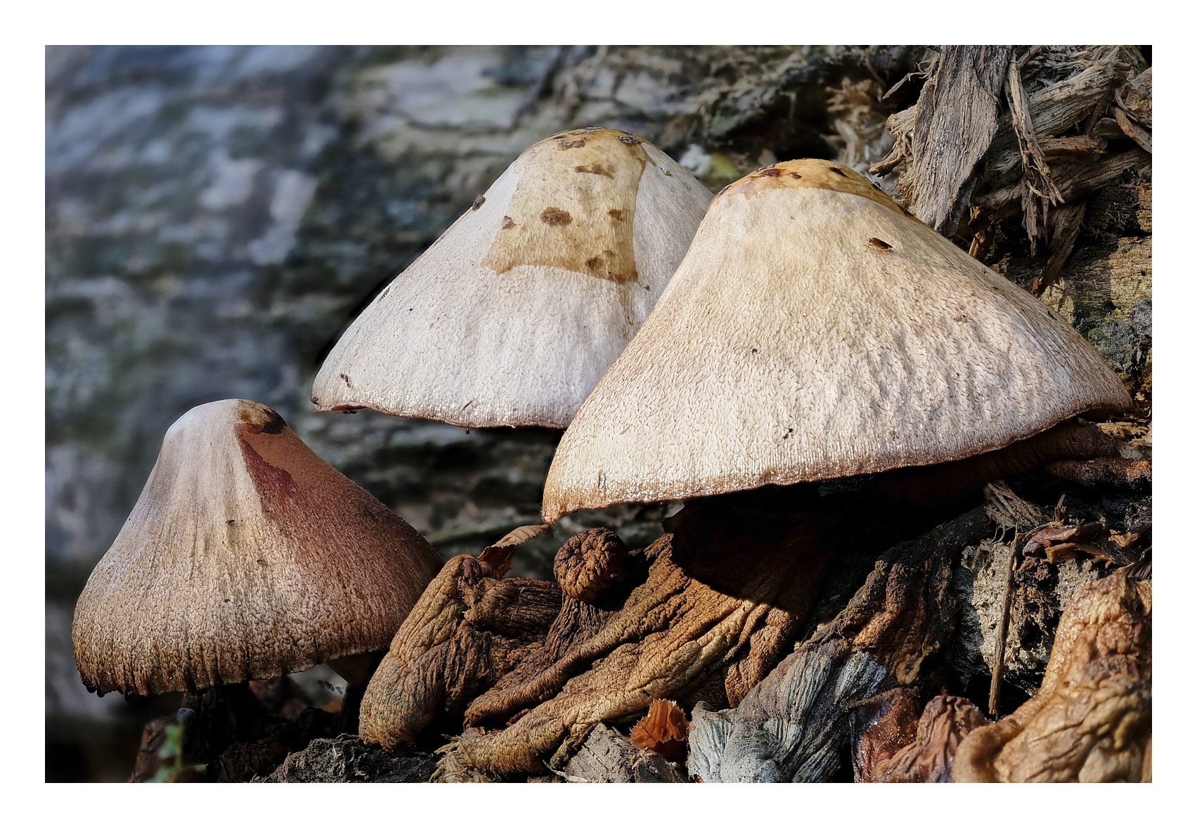 Am Mittwoch haben wir im Maudacher Bruch fotografiert. Dort liegen auf einem Parkplatz seit einigen Jahren abgesägte Baumstämme herum, auf denen sich mittlerweile ziemlich große Pilze und Schwämme breit gemacht haben. Genau die wollten wir fotografieren. Ich muss zugeben, dass diese Motive aus der Nähe betrachtet einen gewissen „Ekligkeitsfaktor“ besitzen. Andererseits sind die Strukturen aber sehr interessant. Jedenfalls habe ich die Bilder mit „Focus Stacking“ aufgenommen, damit dem Betrachter auch wirklich kein Detail entgeht ;-).