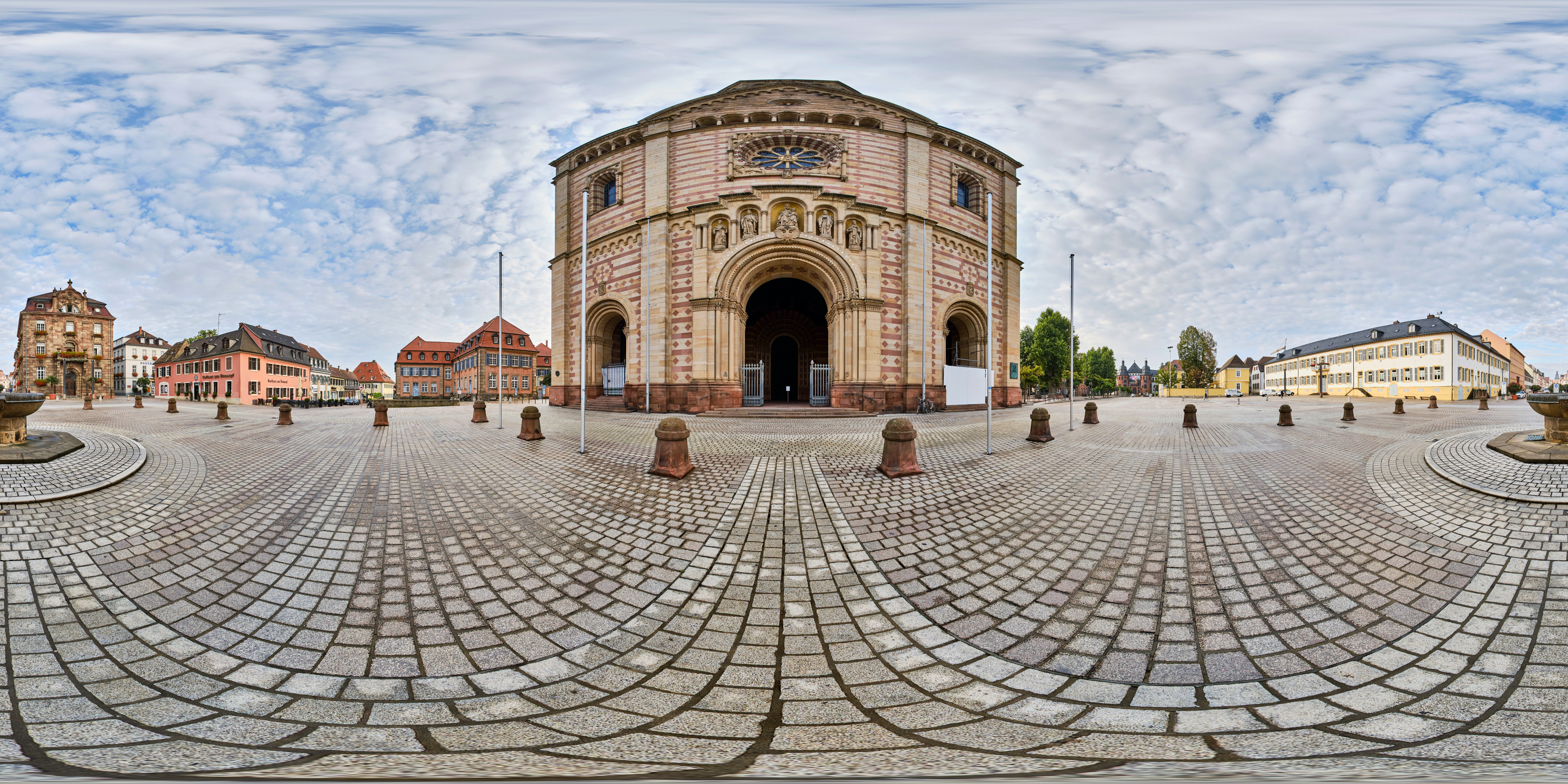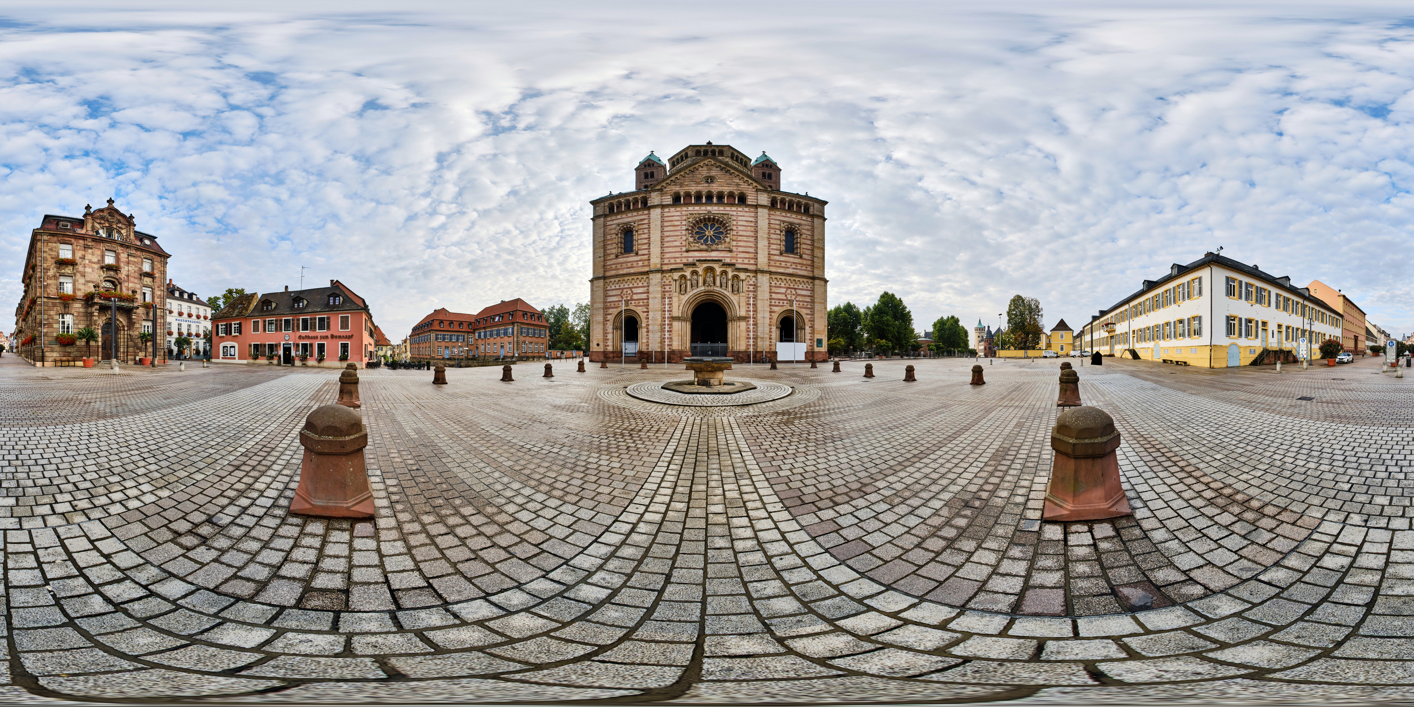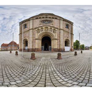 Ich habe zunächst zwei Kugelpanoramen vor dem Dom aufgenommen. Für eine wirklich gute Perspektive müsste man die Kamera eigentlich wesentlich höher bringen. Aber ein so hohes Stativ habe ich nicht und so musste ich mich mit der „Frosch-Perspektive“ begnügen.