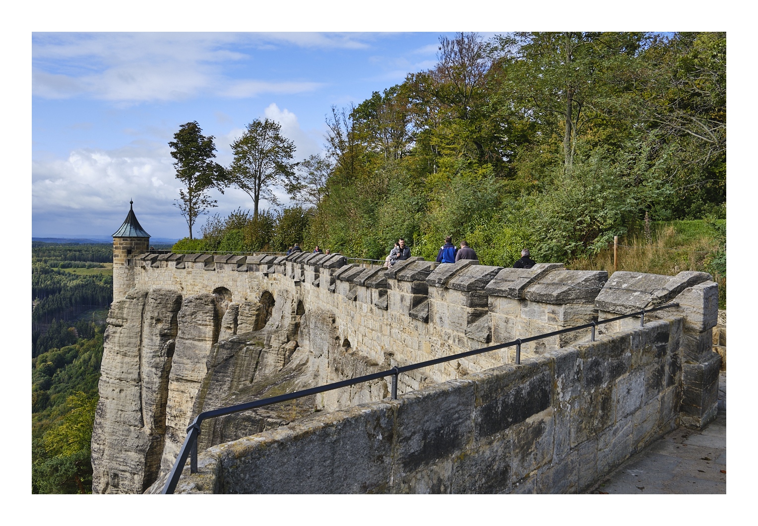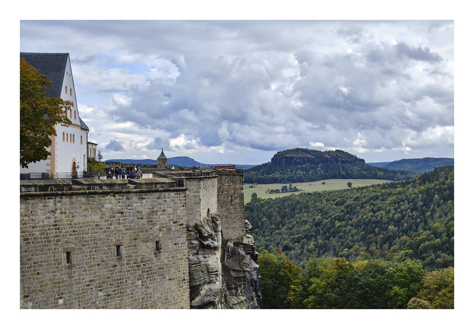 Die Festung Königstein gehört zu den größten Bergfestungen Europas. Sie liegt auf einem Tafelberg oberhalb des gleichnamigen Ortes, verfügt über eine umlaufende Wehrmauer und ca. 50 einzelne Gebäude. Wahrscheinlich gab es hier schon im 12. Jhd. eine steinerne Burg, aber zu größerer Bedeutung gelangte die Anlage erst, nachdem im 16. Jahrhundert ein 152 Meter tiefer Brunnen gebaut worden war. Die militärische Bedeutung der Festung war wohl immer gering. Sie ist auch nie erobert worden. Aber sie hatte eine große historische Bedeutung als Rückzugsort der Sächsischen Kurfürsten, allen voran August des Starken, der die Festung als eine Art „Lustschloss“ nutzte. Die ausgedehnten Gelage, die hier stattgefunden haben, sind legendär. Die Männer wurden vor und nach einem Festmahl gewogen. Wer weniger als zwei Kilo zugelegt hatte, fiel beim Gastgeber in Ungnade. Die verhängnisvolle Waage kann man noch heute bestaunen.