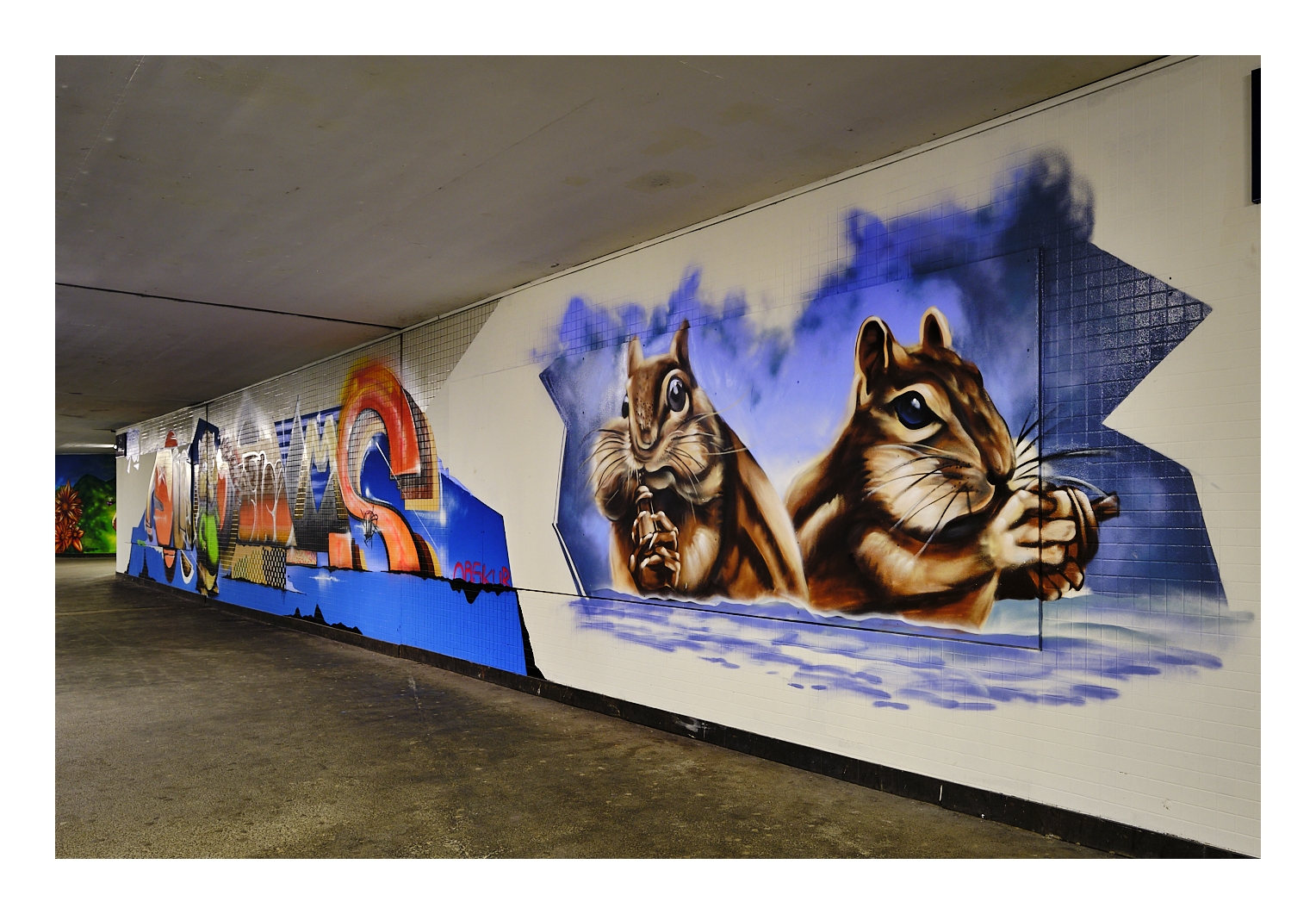 Mich hat diese knallbunte und sowohl künstlerisch als auch handwerklich sehr gut ausgeführte Wandgestaltung wirklich begeistert! Sehr unterschiedliche Themen, Stilarten und Techniken – aber alles passt gut zueinander und wertet die düsteren Tunnel erheblich auf. Ein tolles Projekt!