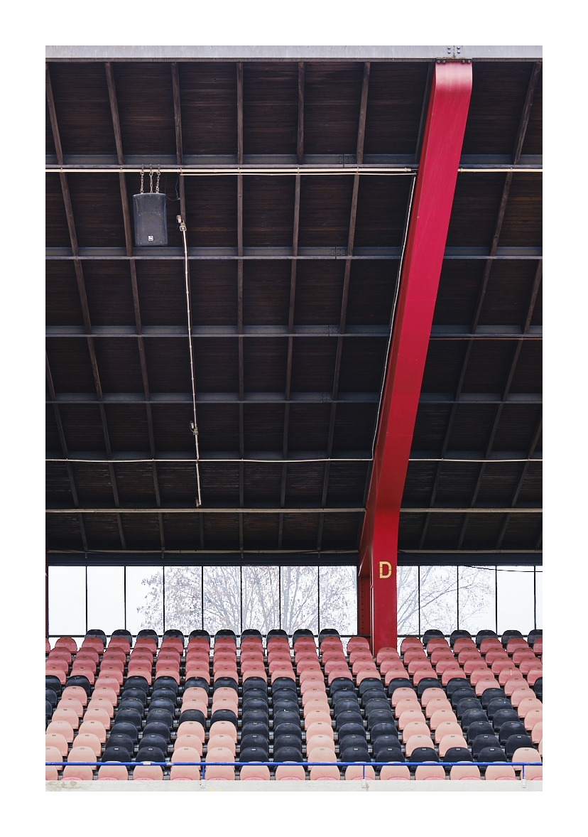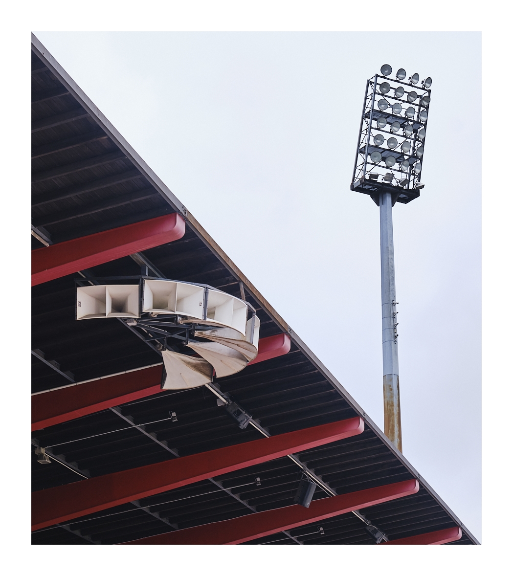 Die Idee für diese Fototour kam ‚mal wieder von Gerd (www.gerd-stauder.de). Mit freundlicher Genehmigung des Bereichs Sport der Stadt Ludwigshafen sind wir am Donnerstagmorgen losgezogen. Leider war das Licht ziemlich „flach“ und der Himmel gleichmäßig trüb, so dass mit leuchtenden Farben nicht zu rechnen war. Andererseits bekamen meine Bilder durch diese Art der „Beleuchtung“ einen leicht melancholischen Charakter, der vielleicht ganz gut passte. Wir haben uns etwa zwei Stunden im Stadion aufgehalten und die unterschiedlichsten Perspektiven ausprobiert. Ein Panorama (aus fünf Einzelaufnahmen) gehörte natürlich auch dazu.