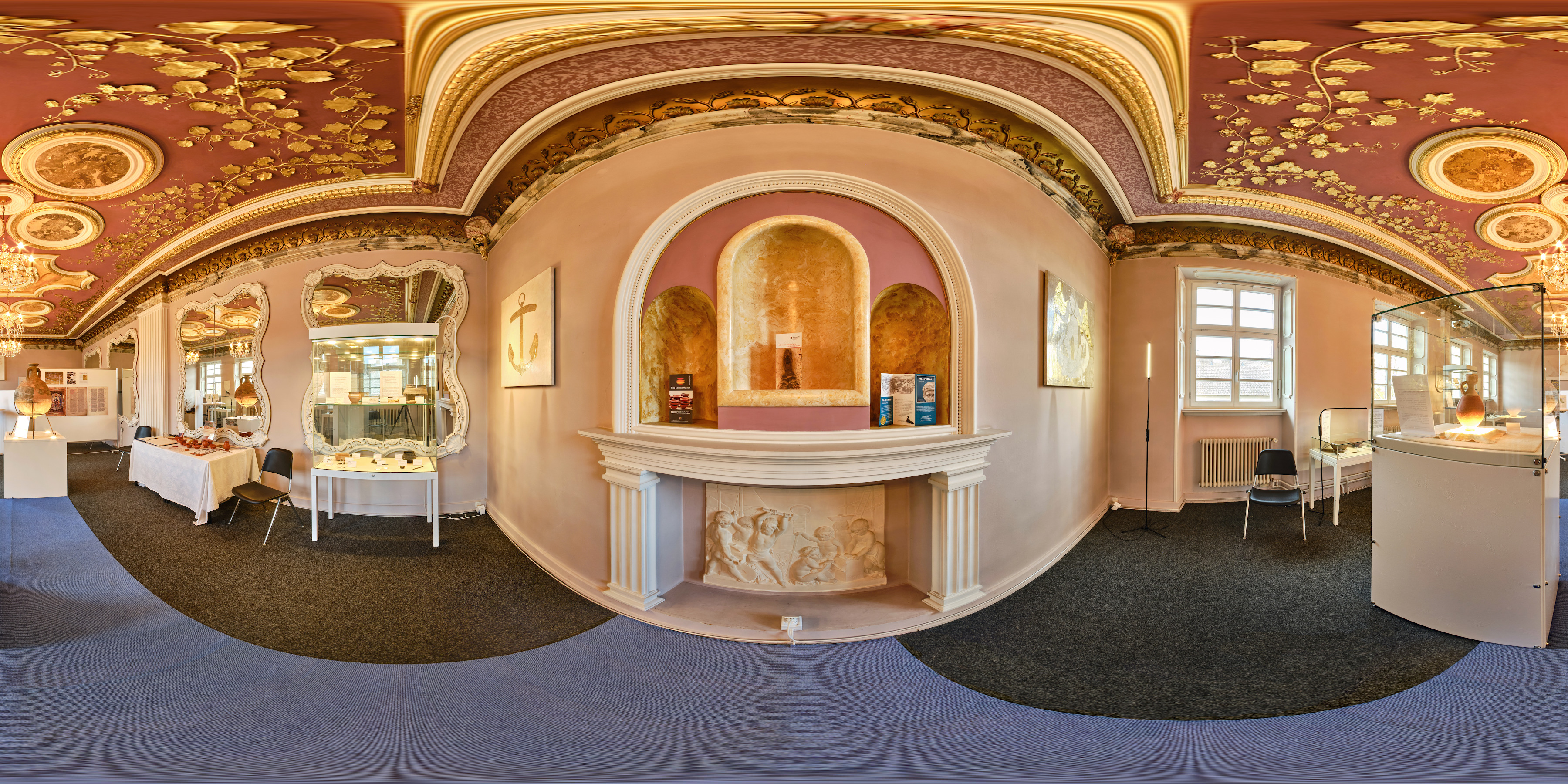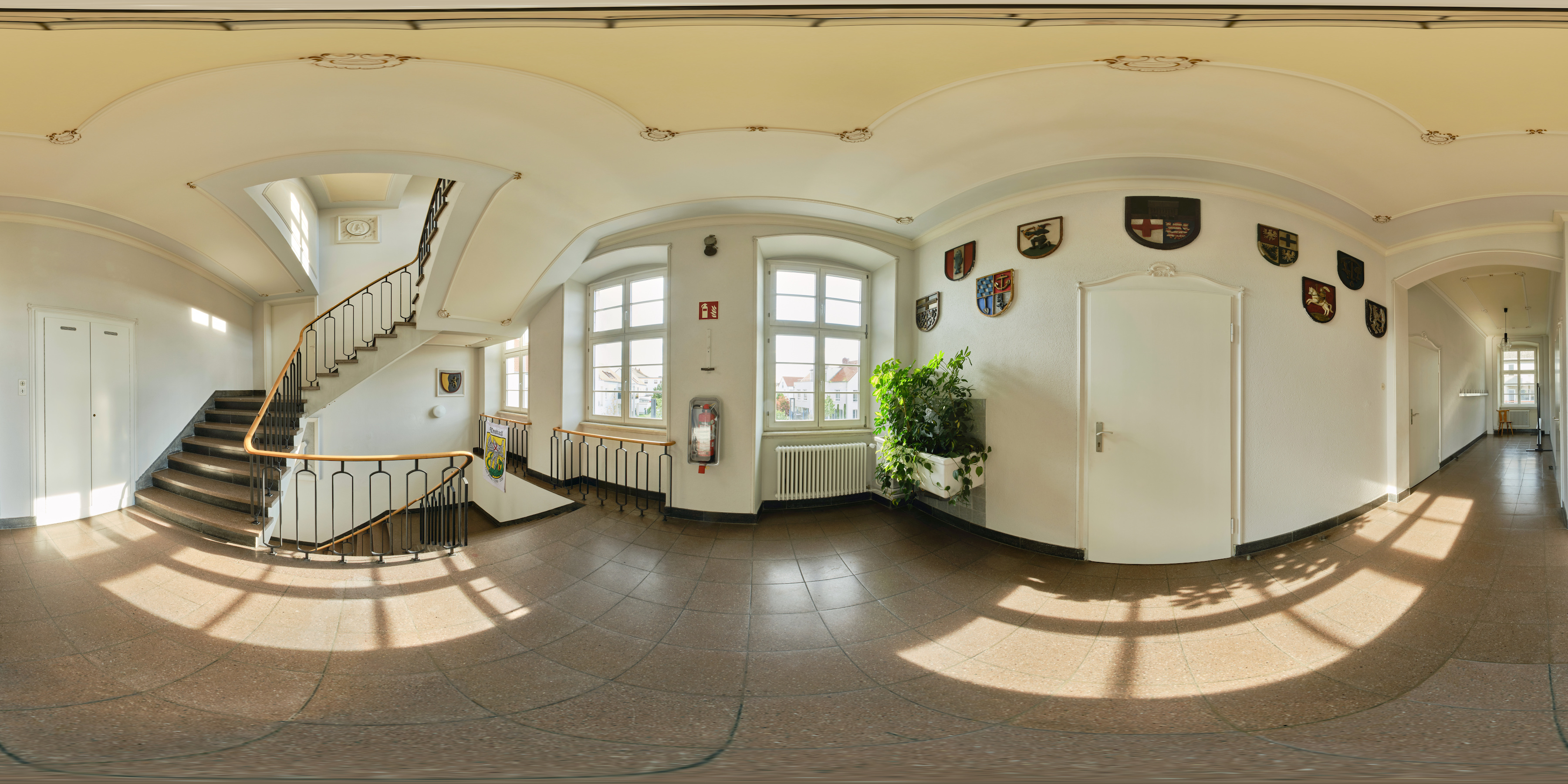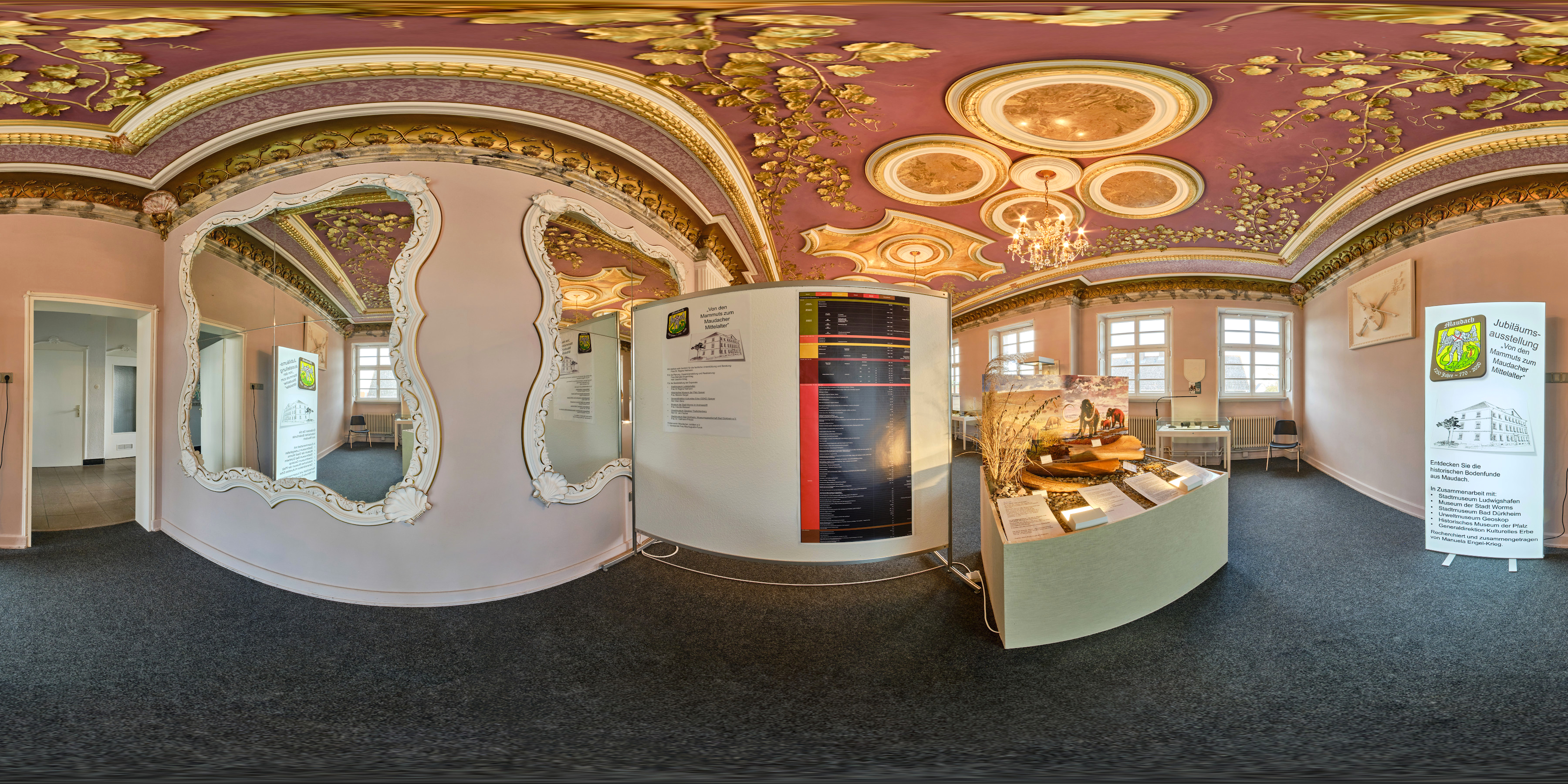 Jetzt folgen sechs interaktive Kugelpanoramen und eine kleine Galerie mit verschiedenen Projektionen. Im großen, prächtig ausgestatteten Spiegelsaal, dem Hauptraum des Museums, habe ich von drei verschiedenen Standorten aus fotografiert. Ein wirklich sehenswerter Raum mit einer sehenswerten Ausstellung! Ein weiteres Panorama ist im zweiten, kleineren Museumsraum im Zwischengeschoss entstanden, der mir trotz des fehlenden Schmucks auch sehr gut gefallen hat. Und schließlich habe ich noch zwei Panoramen im Flur bzw. Treppenhaus versucht. Leider hatte ich nicht die Möglichkeit, das Trauzimmer zu fotografieren.