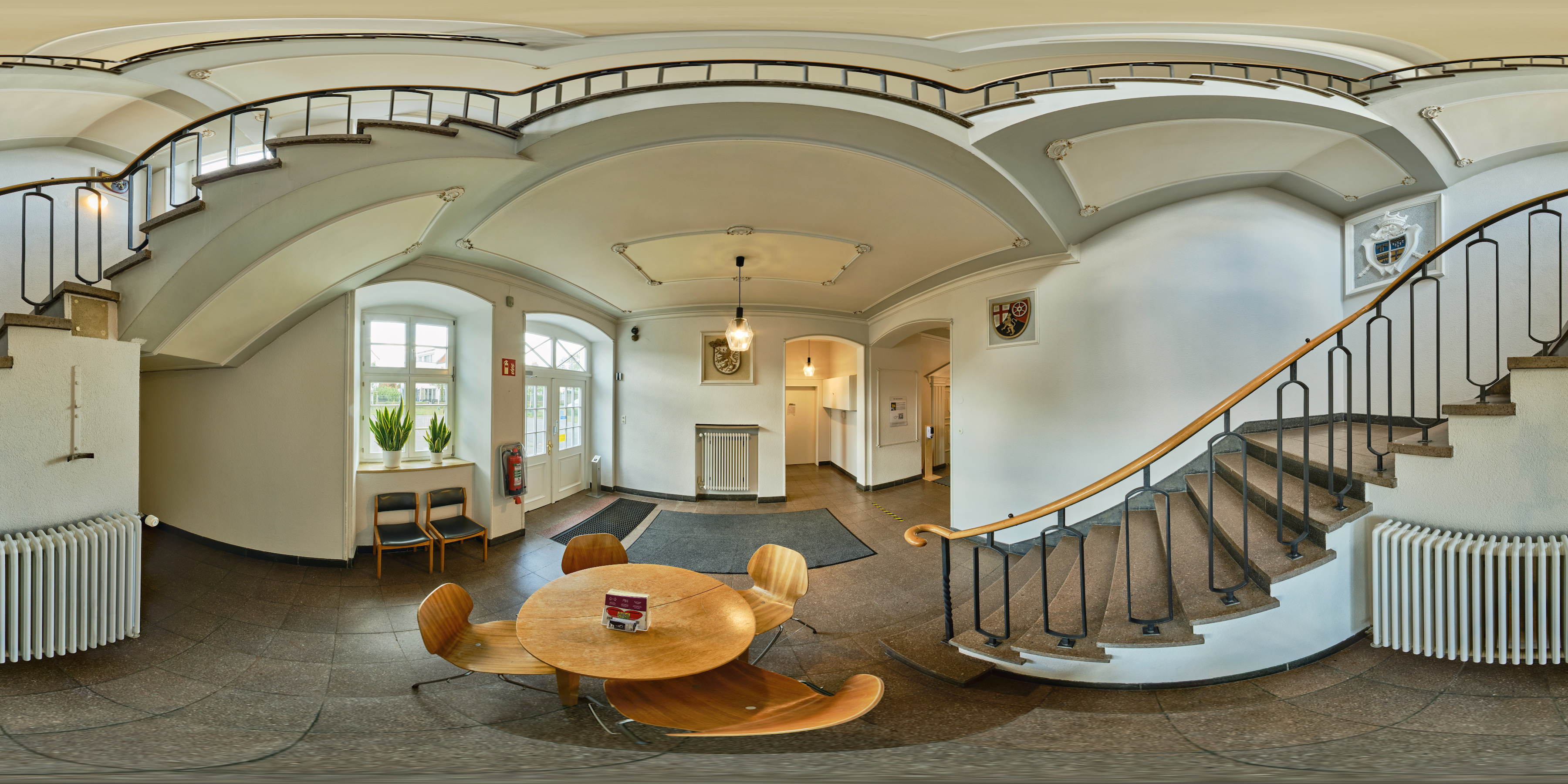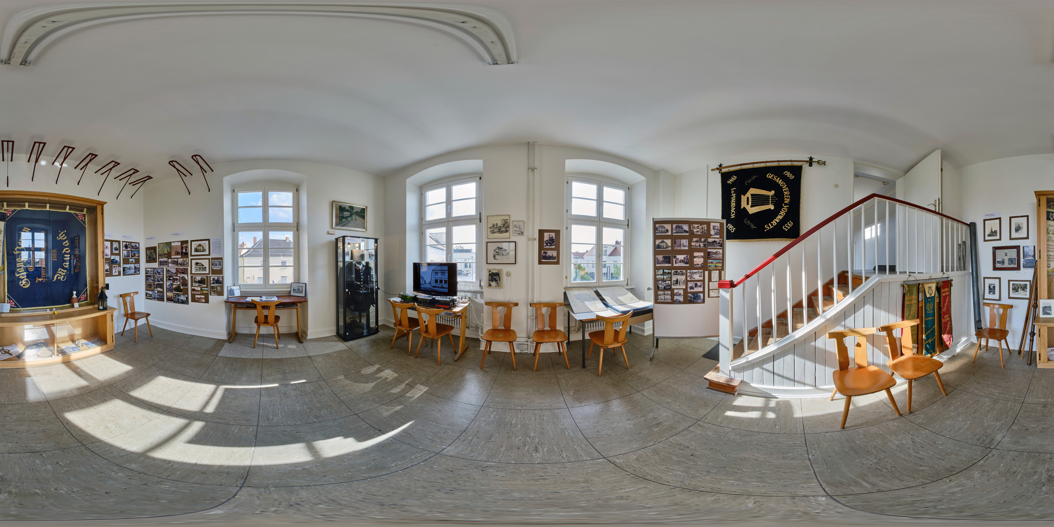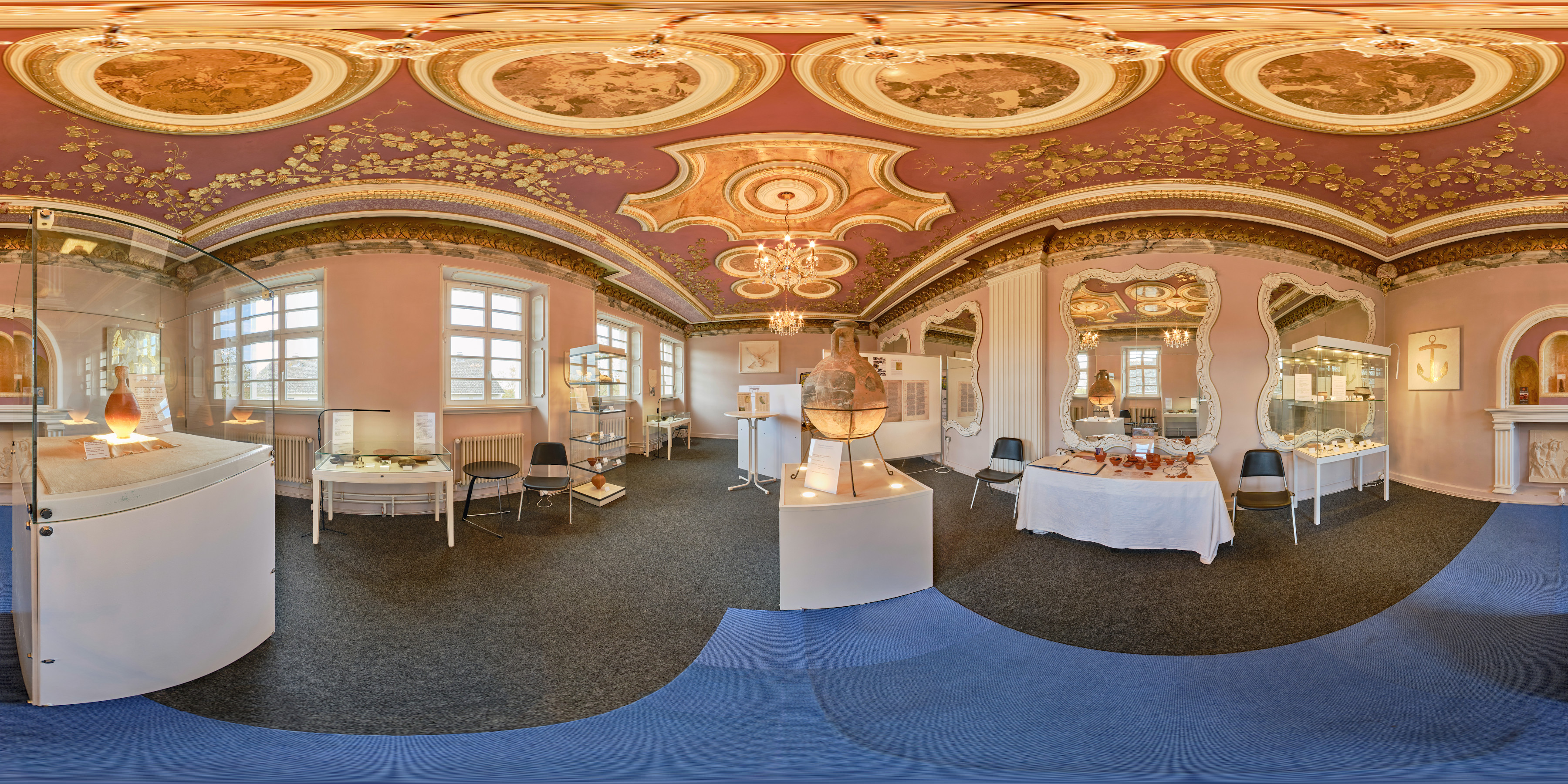 Jetzt folgen sechs interaktive Kugelpanoramen und eine kleine Galerie mit verschiedenen Projektionen. Im großen, prächtig ausgestatteten Spiegelsaal, dem Hauptraum des Museums, habe ich von drei verschiedenen Standorten aus fotografiert. Ein wirklich sehenswerter Raum mit einer sehenswerten Ausstellung! Ein weiteres Panorama ist im zweiten, kleineren Museumsraum im Zwischengeschoss entstanden, der mir trotz des fehlenden Schmucks auch sehr gut gefallen hat. Und schließlich habe ich noch zwei Panoramen im Flur bzw. Treppenhaus versucht. Leider hatte ich nicht die Möglichkeit, das Trauzimmer zu fotografieren.