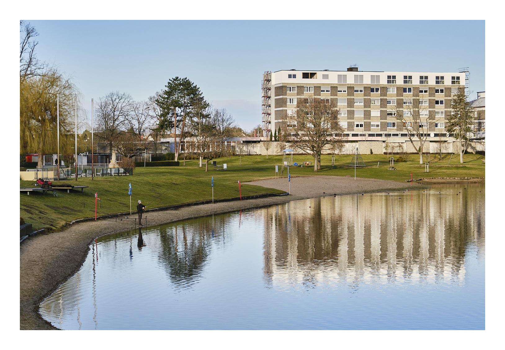 Das Frankenthaler Strandbad ist eine Mischung aus Parkanlage, Freibad, Badeweiher und Naturschutzgebiet. Es ist außerhalb der Badesaison frei zugänglich und wird derzeit hauptsächlich von Spaziergängern und Joggern besucht. Badegäste waren bei unserem Besuch am Freitagmorgen (3 Grad plus) nicht zu finden. Dafür hatten wir aber in der ersten halben Stunde schönes weiches Morgenlicht, was die fotografischen Möglichkeiten deutlich verbesserte.